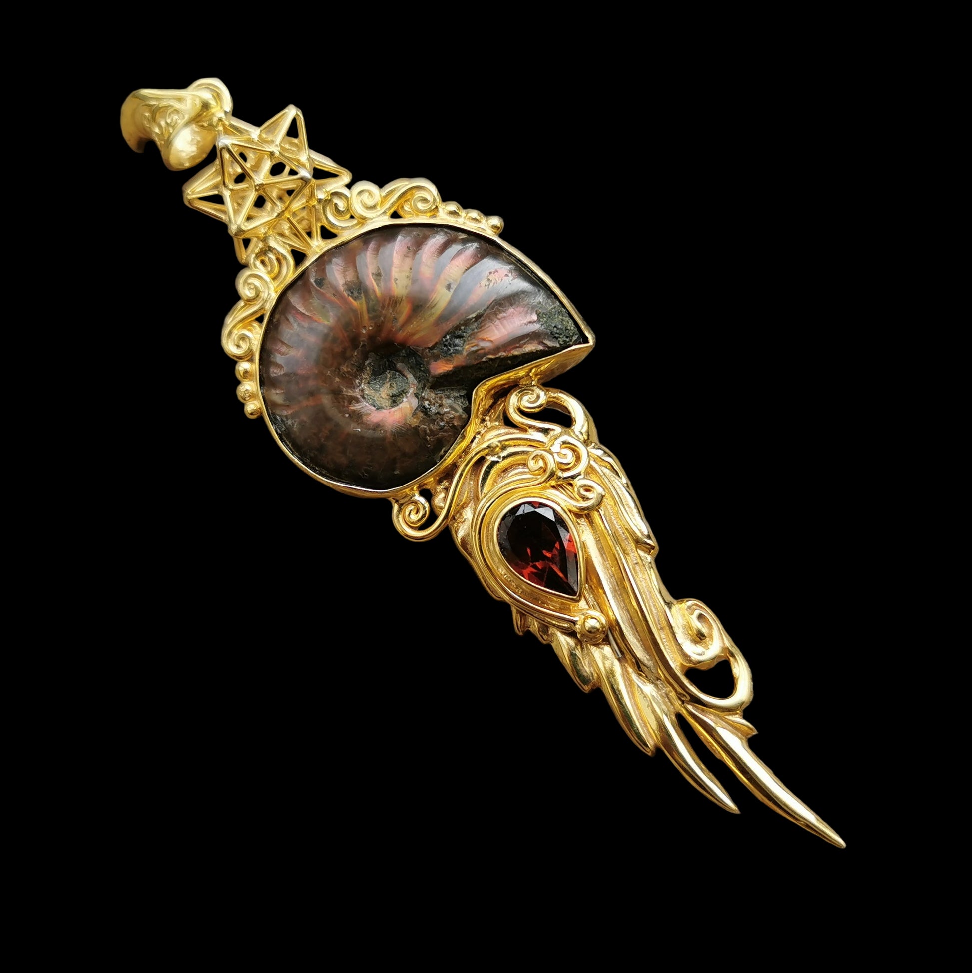 Ref.PD1091 - Gold plated on silver pendant with Solar Star geometry, ammonite fossil, and garnet gemstone.