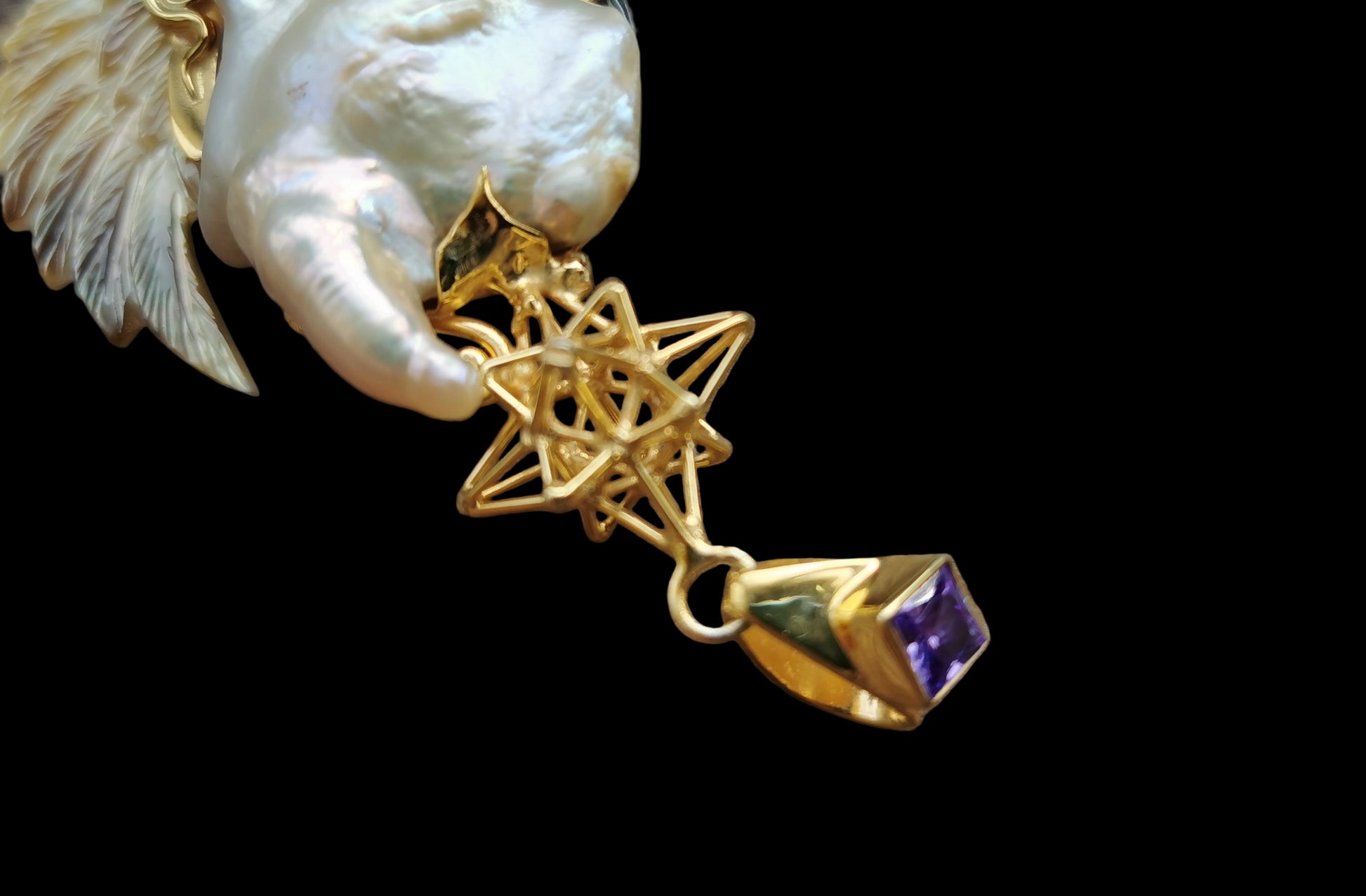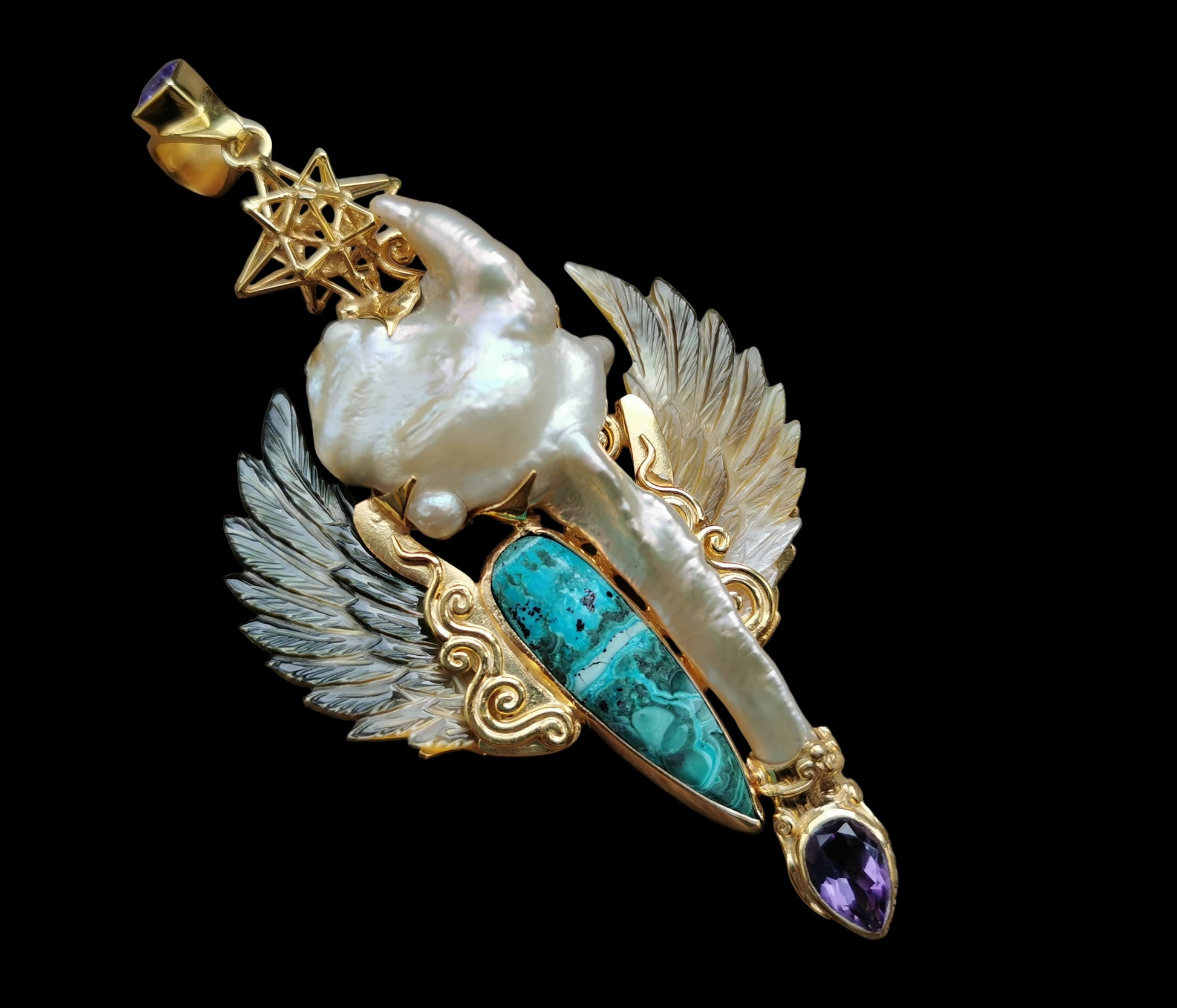 Ref.PD1092 - Gold plated on silver pendant with Heart Star geometry, South sea's pearl, mother of pearl carved wings, amethyst [bale], malachite, and amethyst gemstones.