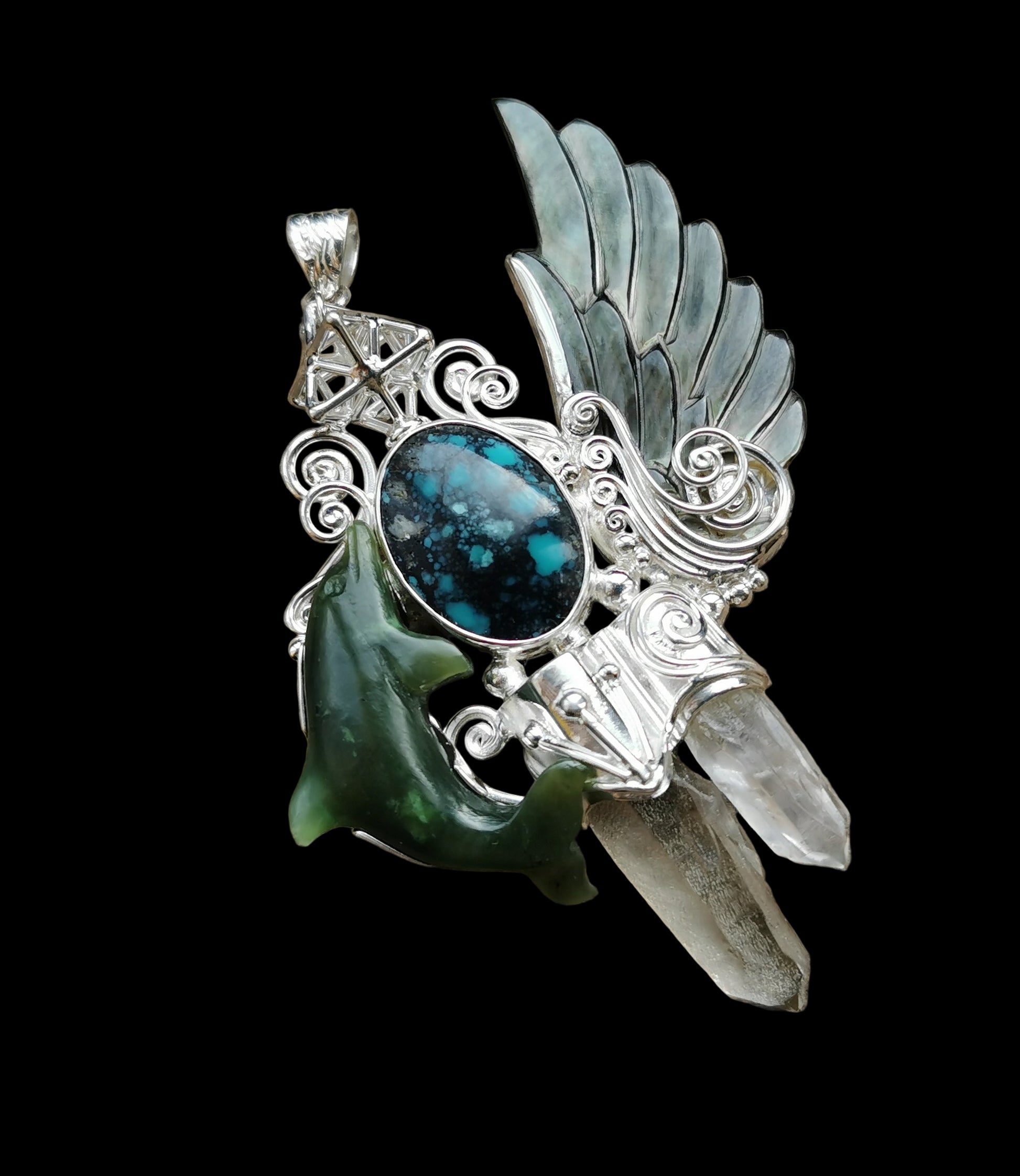 Ref.PD1095 - Silver pendant with Tantric Star geometry, mother of pearl carved wing, jade carved dolphin, laser quartz crystal, and turquoise gem.