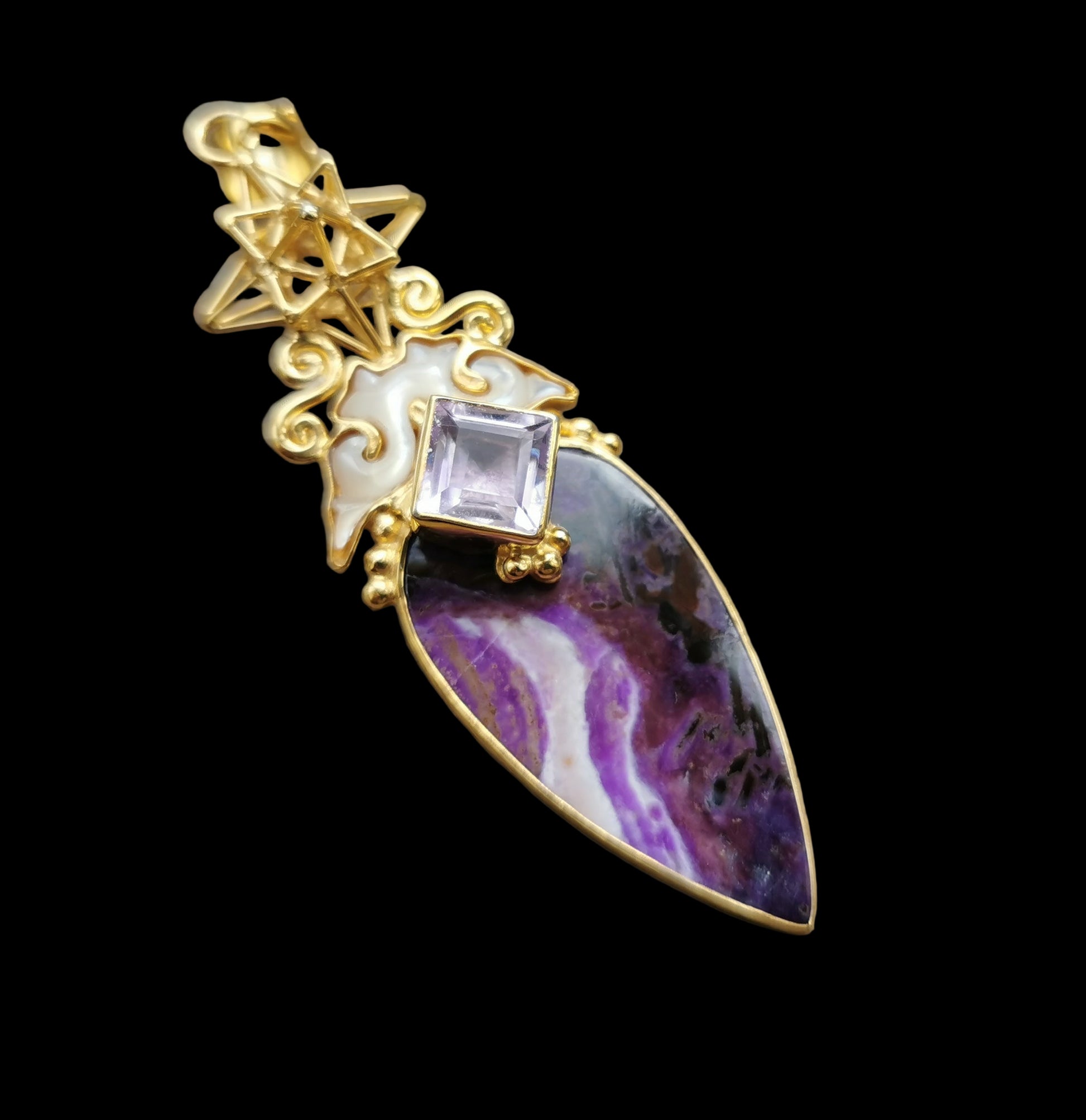 Ref.PD1097 - Gold plated on silver pendant with Heart Star geometry, mother of pearl carved decoration, sugilite, and amethyst gemstones.