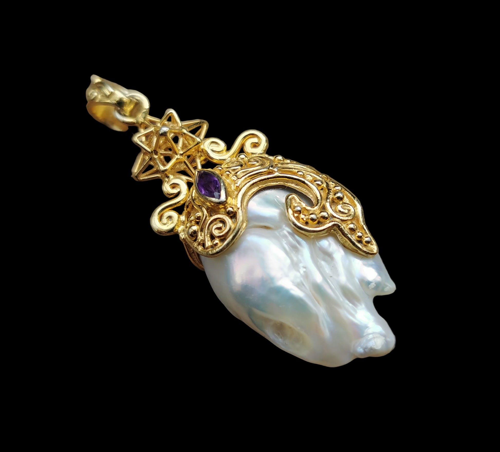 Ref.PD1098 - Gold plated on silver pendant with Heart Star geometry, South sea's pearl, and amethyst gemstone.