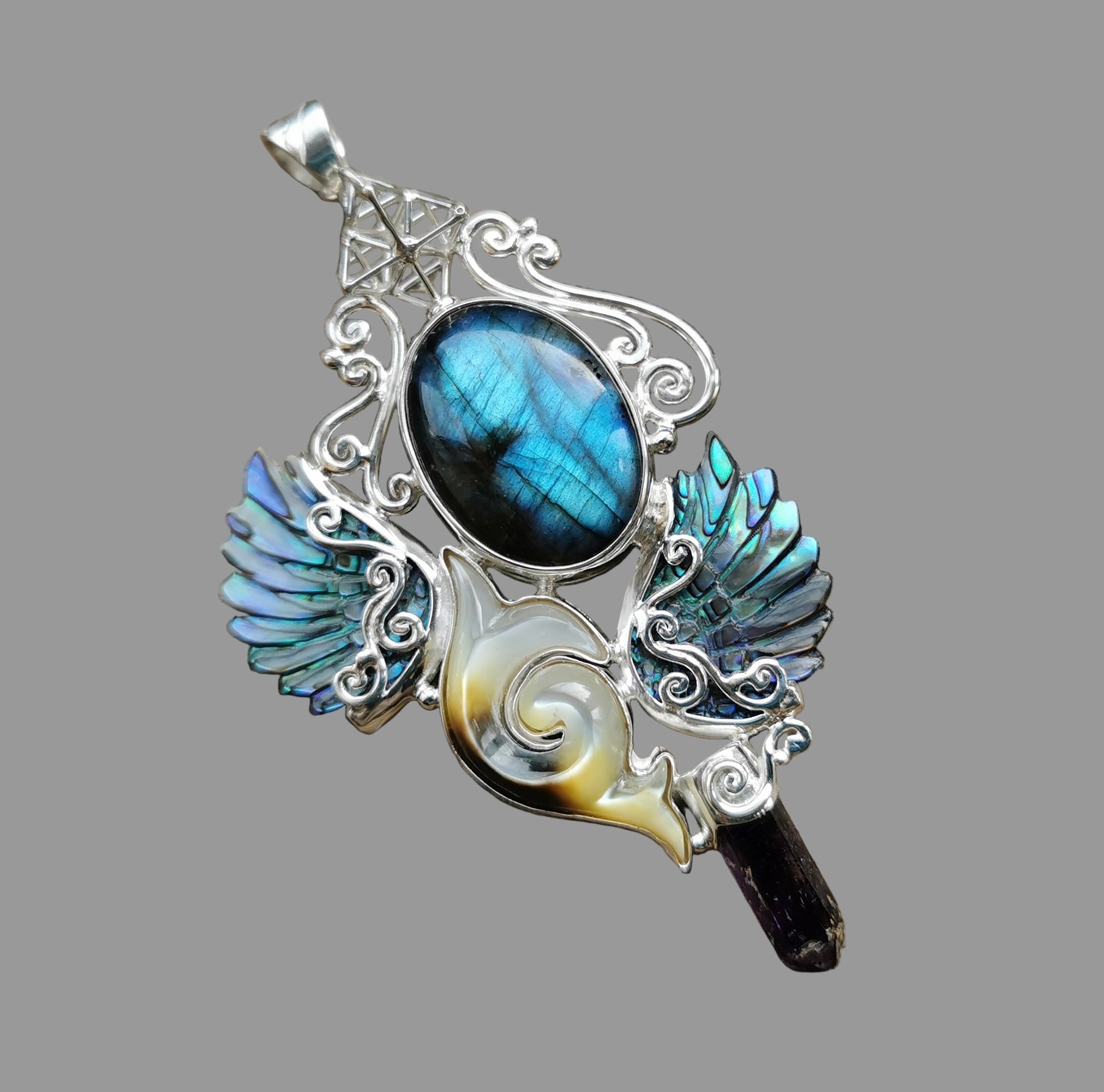 Ref.PD1101 - Silver pendant with Tantric Star geometry, abalone carved wings, mother of pearl carved clouds, labradorite, and amethyst gems.