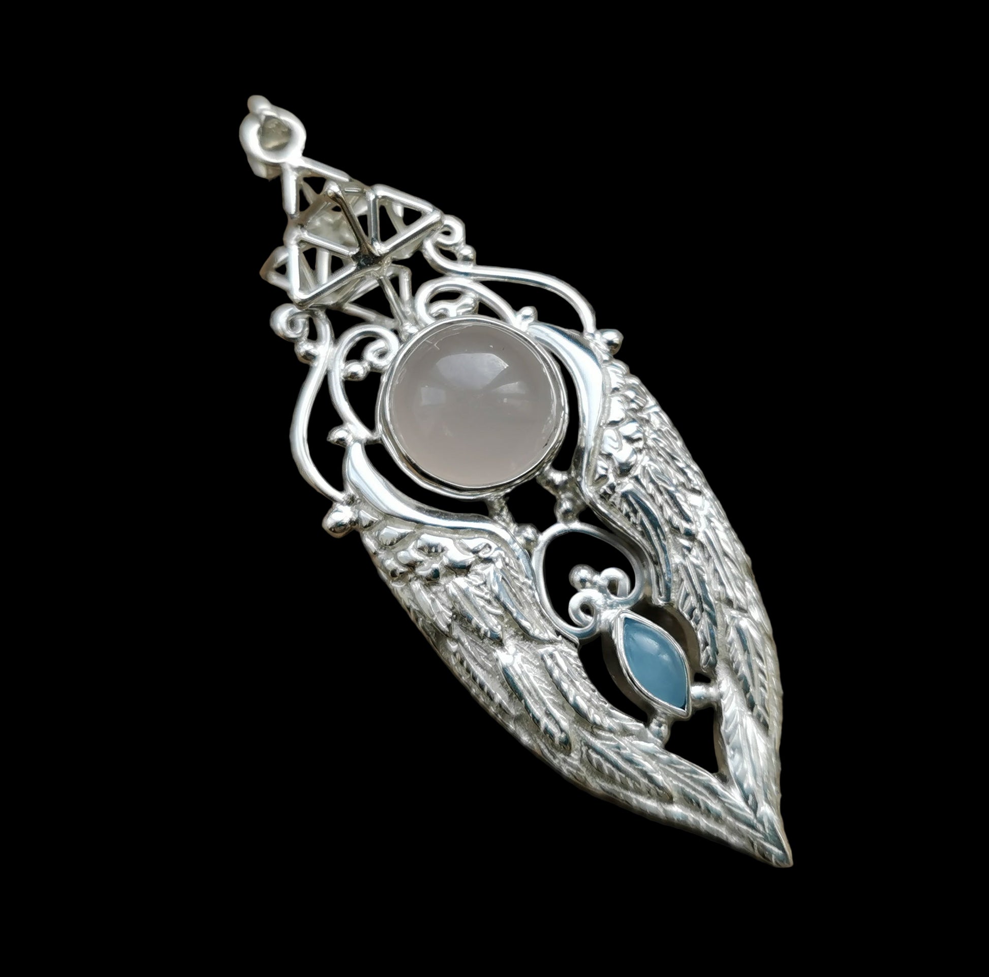 Ref.PD1101 - Silver pendant with Tantric Star geometry, rose quartz crystal, and moonstone gem.