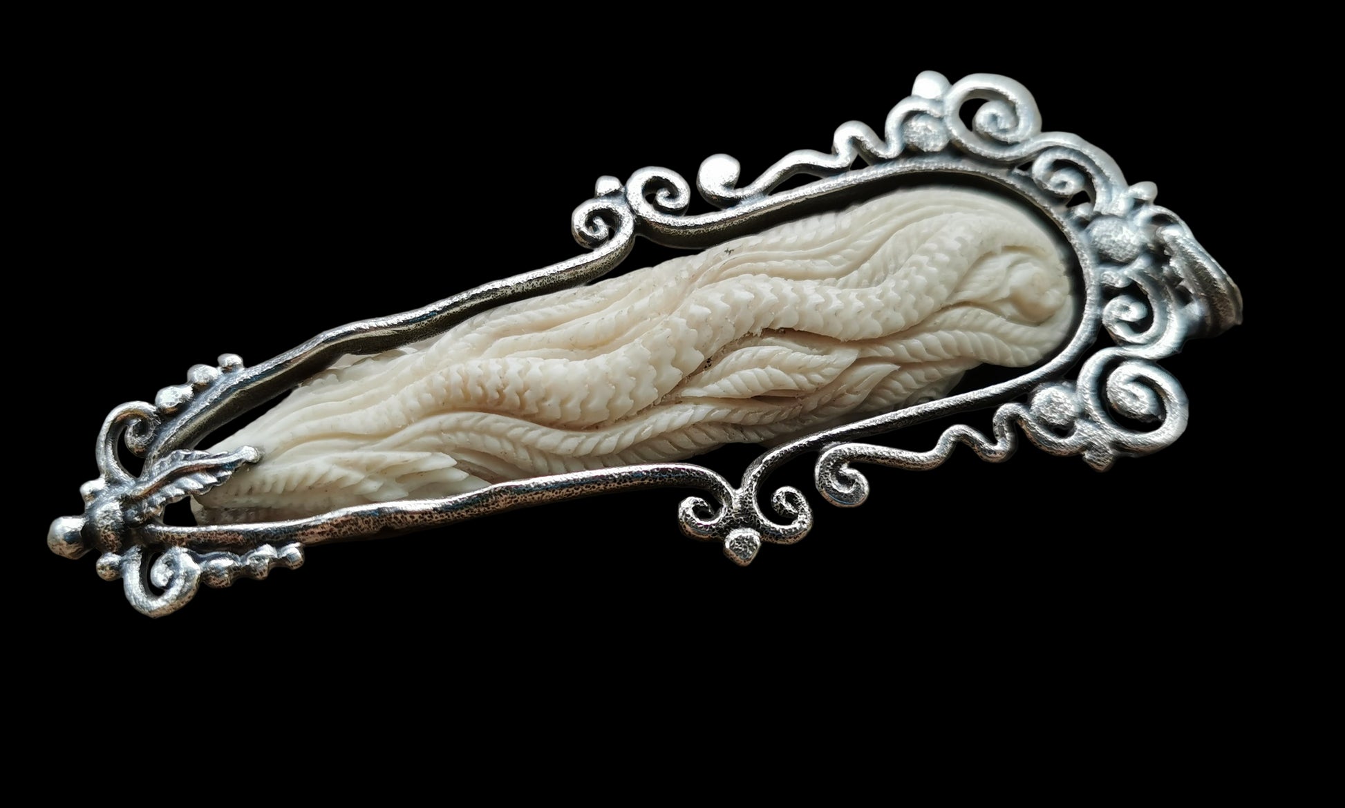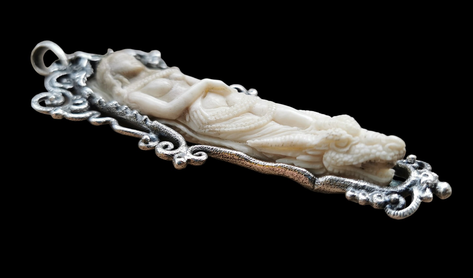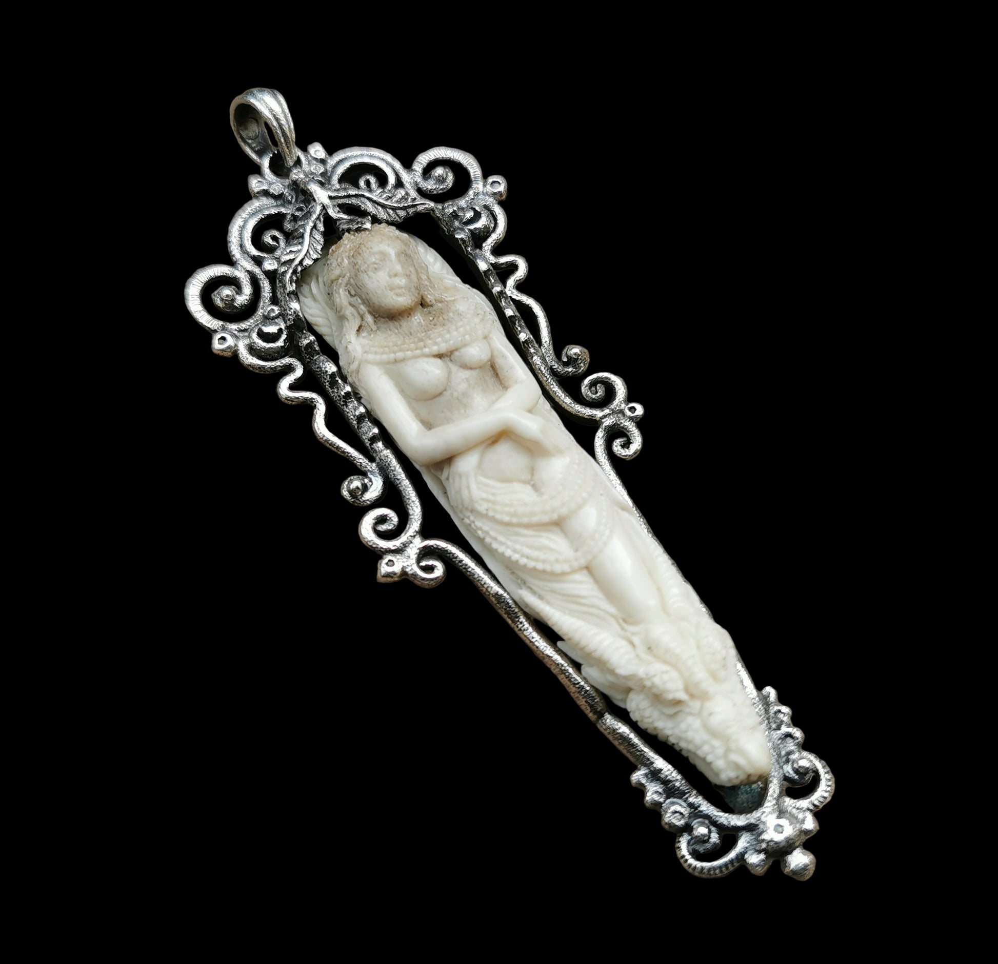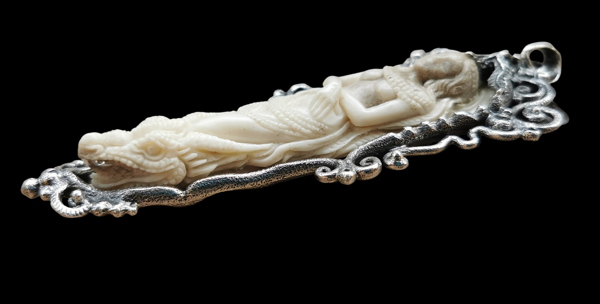 Ref.PD1108 - Silver pendant with ecologically sourced deer horn carved woman & dragon.