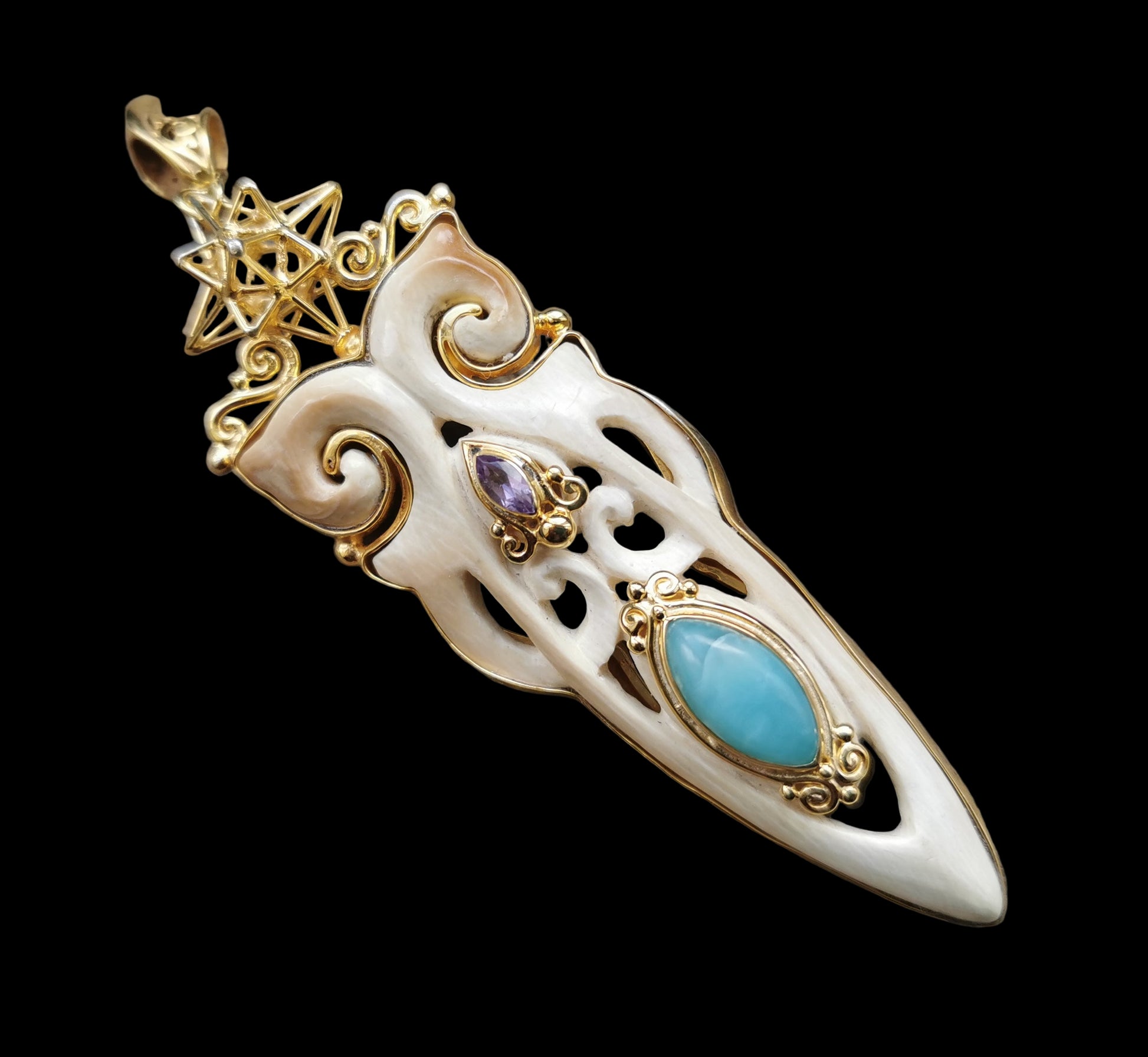 Ref.PD1111 - Gold plated on silver pendant with Heart Star geometry, mammoth carved decorative art nouveaux motif, larimar, and amethyst gemstones.