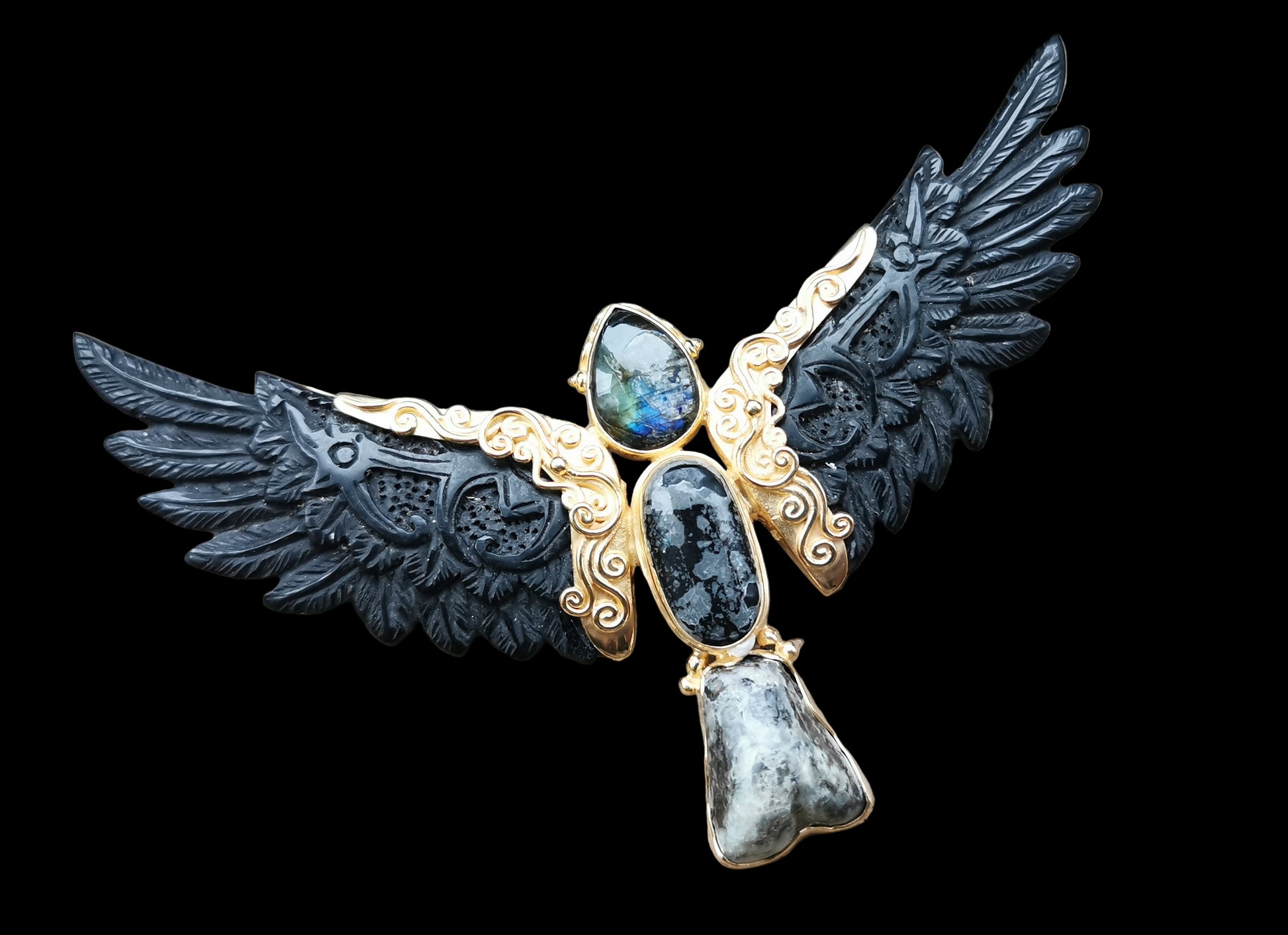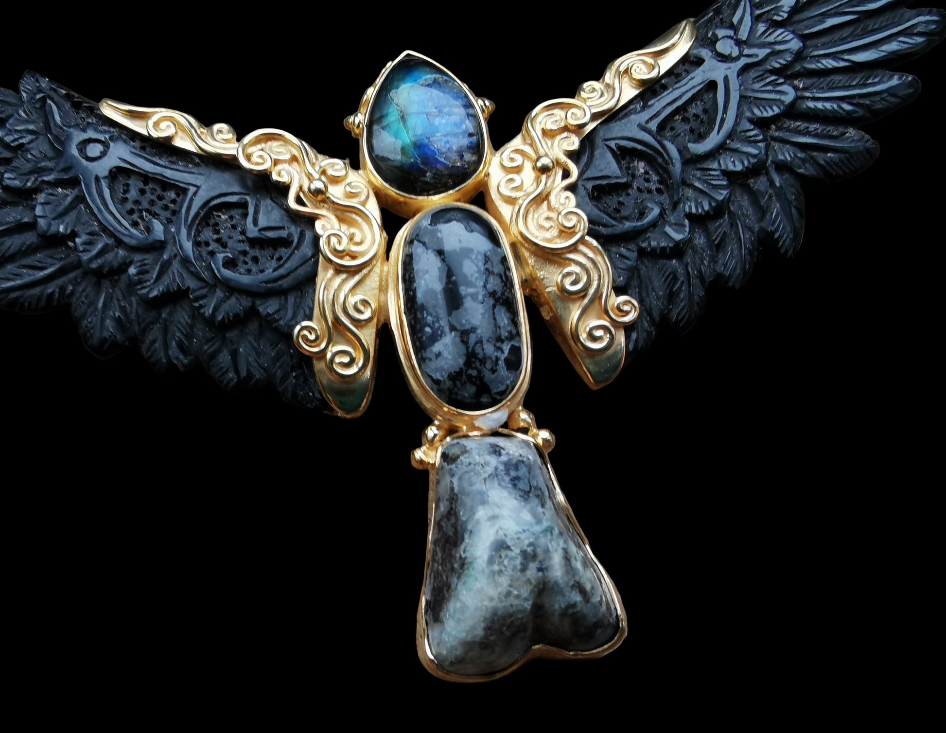 Ref.PD1114 - Gold plated on silver pendant with arang wood carved wings, turquoise, and fossilised wood opal gems.