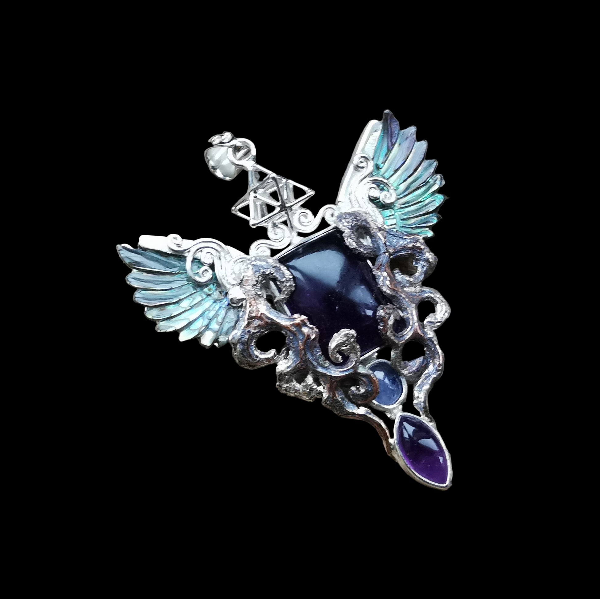 Ref.PD1116 - Silver pendant with Tantric Star geometry, abalone shell carved wings, moonstone, and amethyst gems.