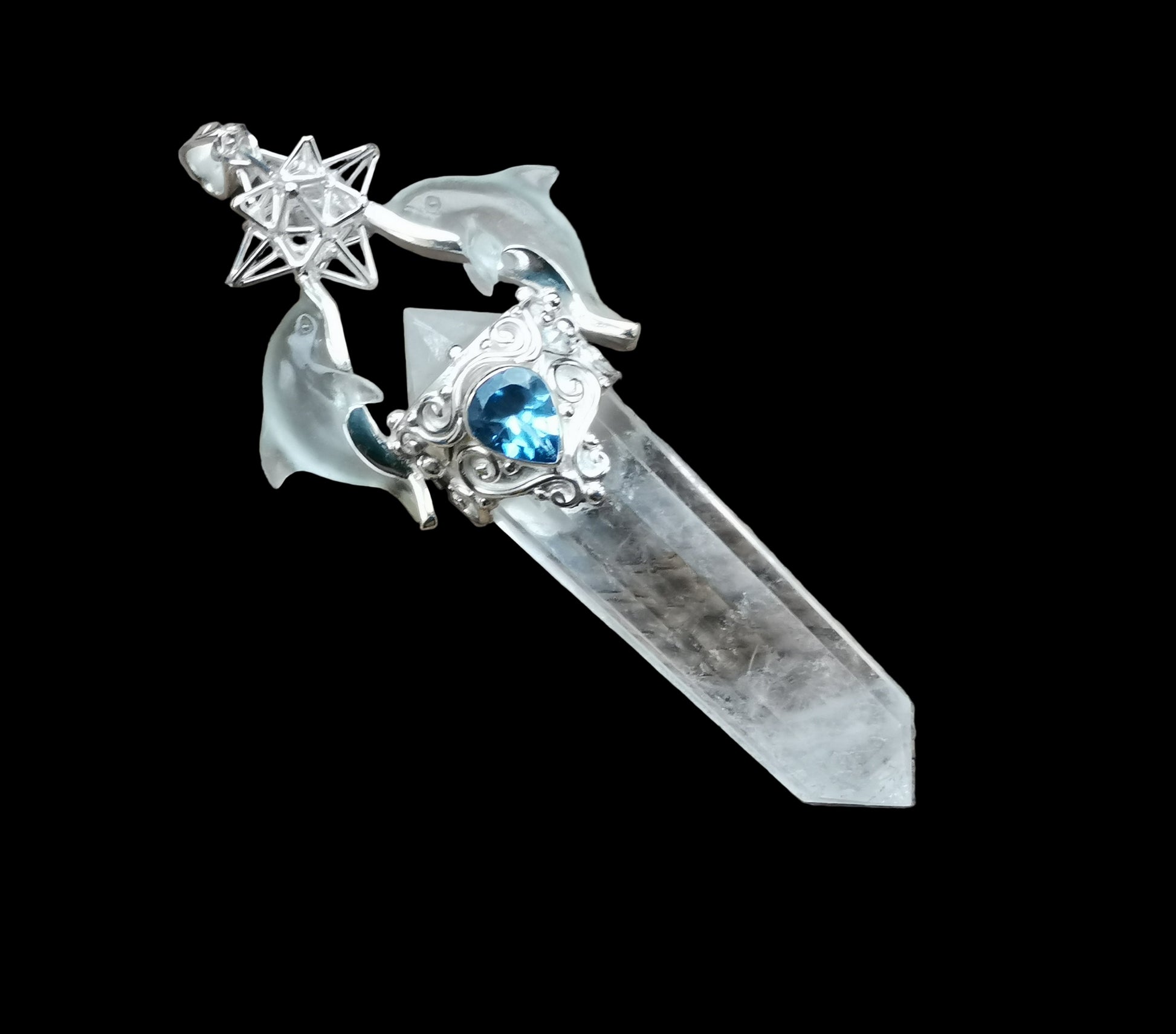Ref.PD1117 - Silver pendant with Heart Star geometry, 12 sided Vogel quartz crystal, dolphins, and sky blue topaz gem.