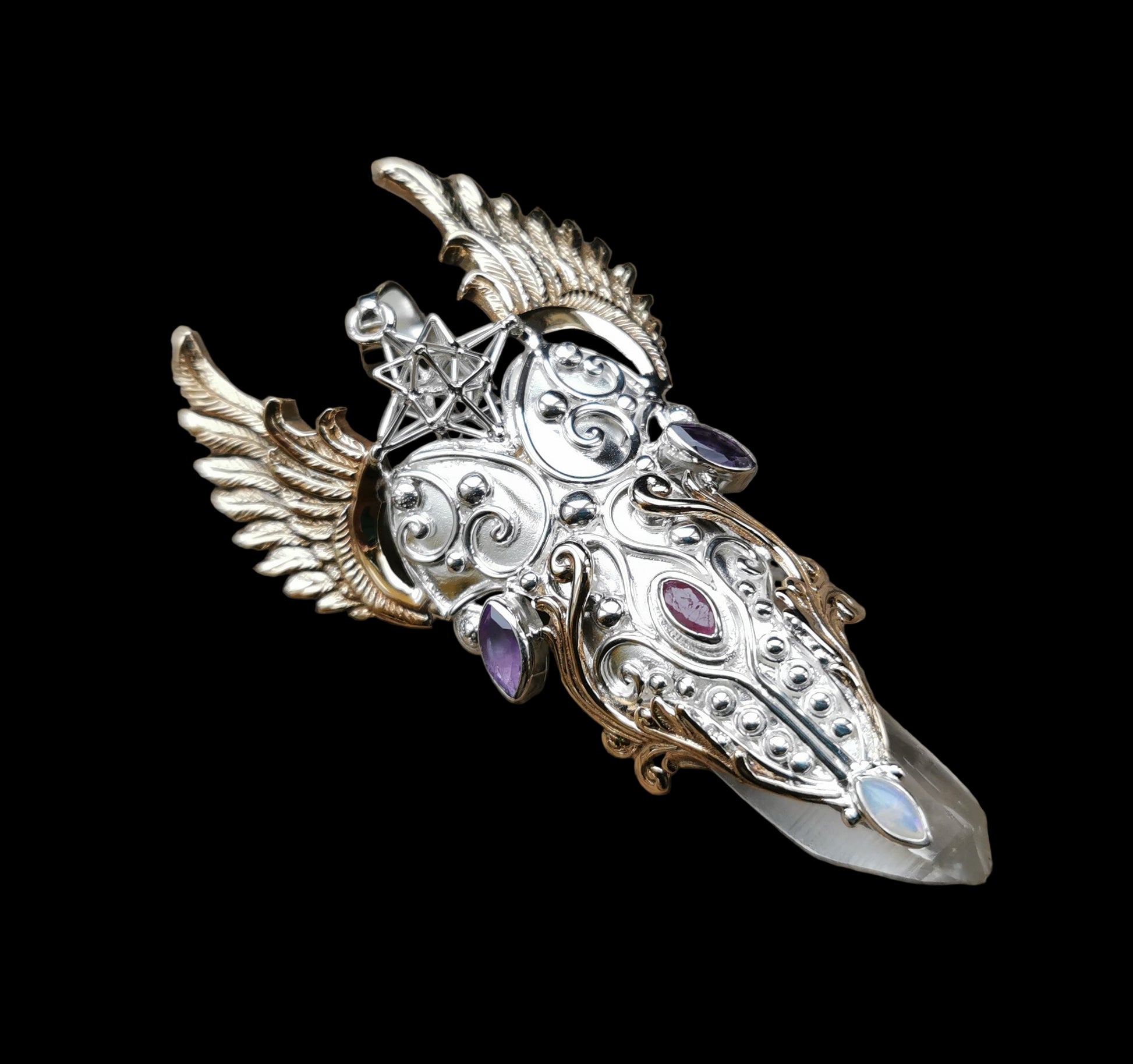 Ref.PD1120 - Silver pendant with Heart Star geometry, brass wings, laser quartz crystal, amethyst, garnet, and moonstone gems.