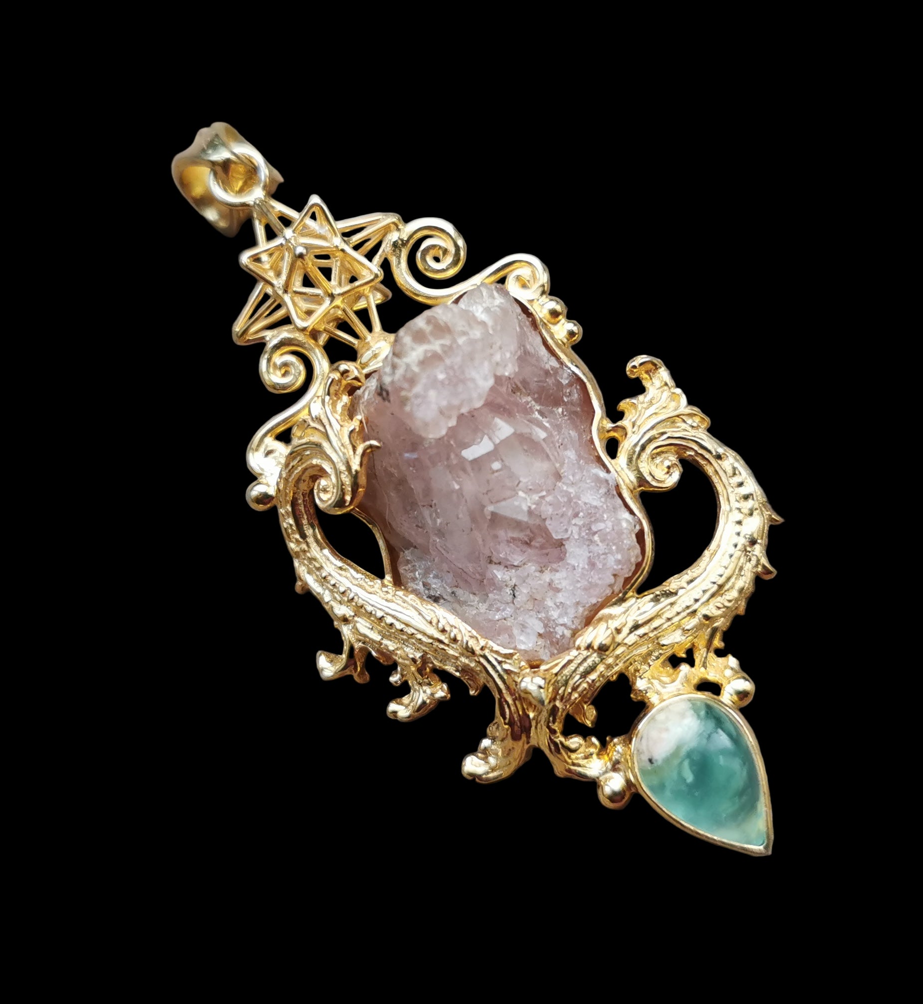 Ref.PD1121 - Gold plated on silver pendant with Heart Star geometry, rose quartz celestial, and Andean opal gemstones.