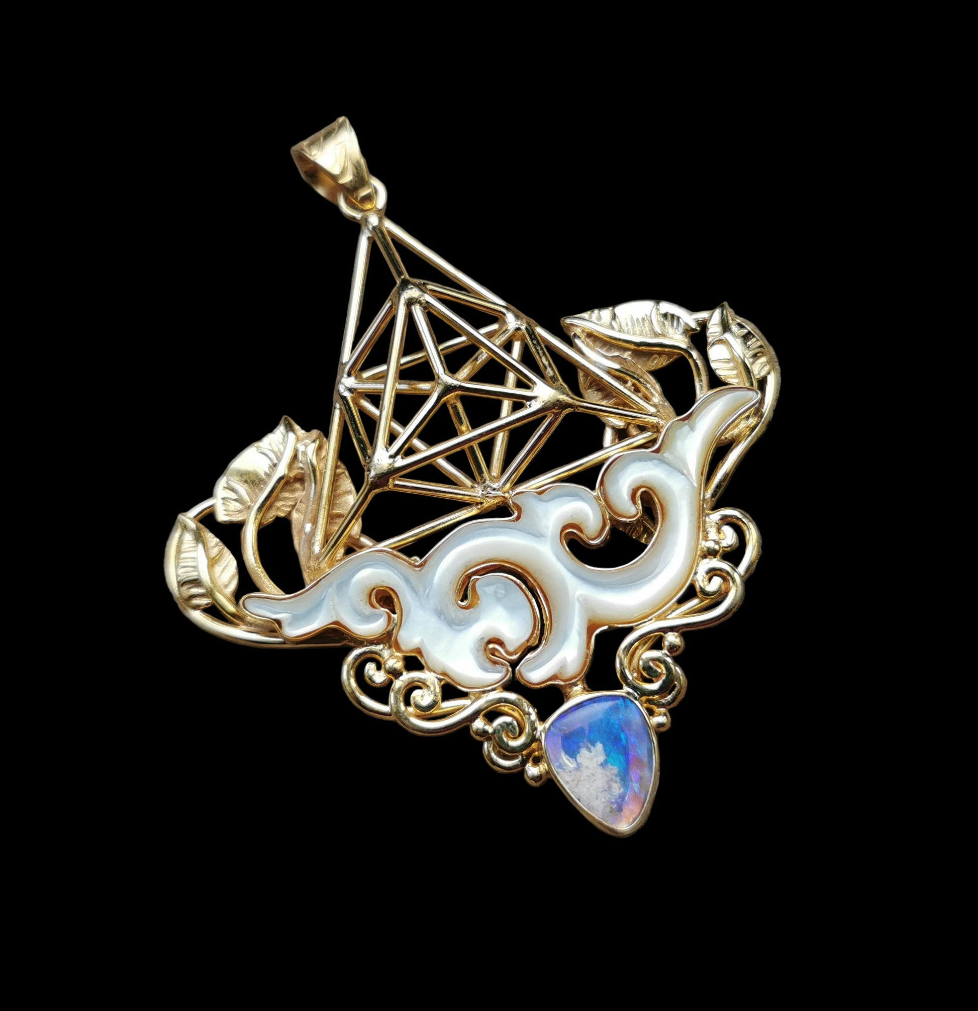 Ref.PD1122 - Gold plated on silver pendant with Tetra Prana geometry & leaves, mother of pearl carved cloud, and opal gem.