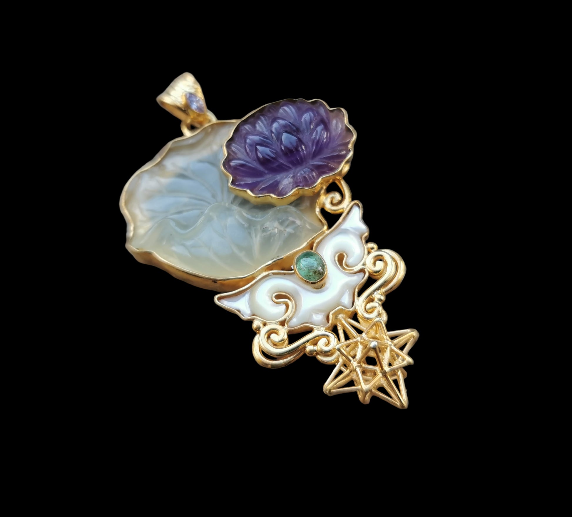 Ref.PD1126 - Gold plated on silver pendant with Heart Star geometry, amethyst carved lotus flower, mother of pearl carved leaves, chrysophrase, and emerald gemstones.