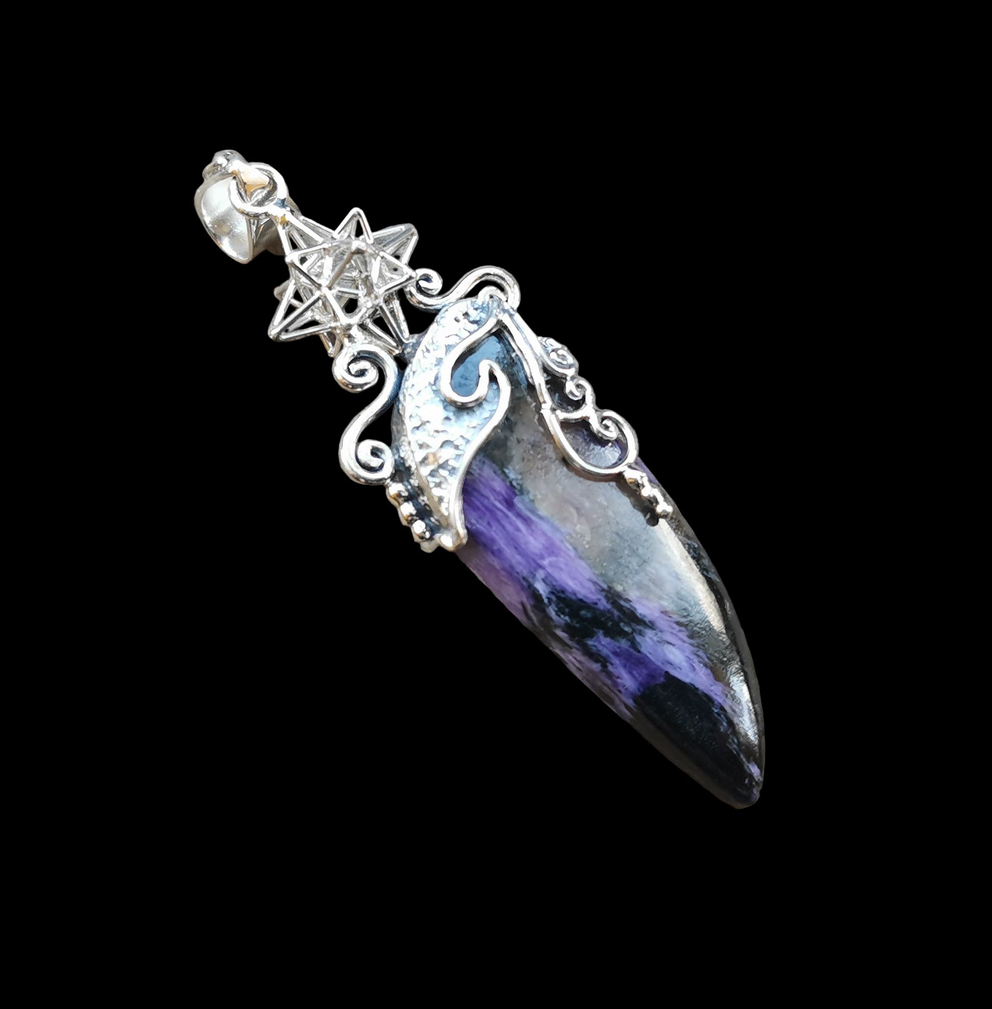 Ref.PD1127 - Silver pendant with Heart Star geometry and charoite gemstone.