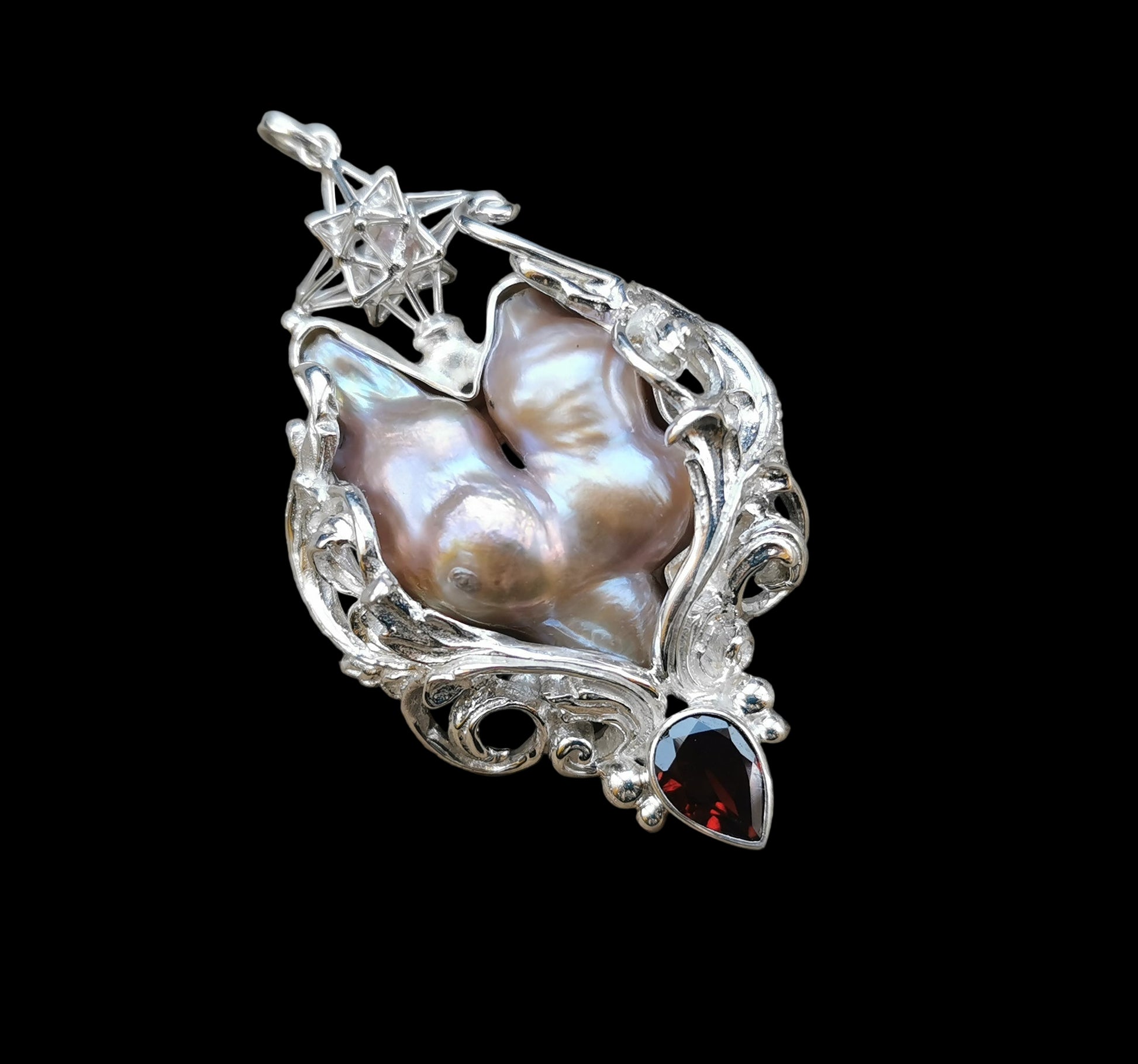 Ref.PD1130 - Silver pendant with Heart Star geometry, South seas pearl, and garnet gemstone.