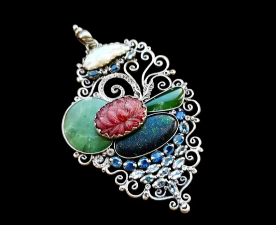 Ref.PD1131 - Gold plated on silver pendant with natural freshwater pearl, ruby carved lotus flower, black opal, jade, sapphire, and sky blue topaz gemstone.