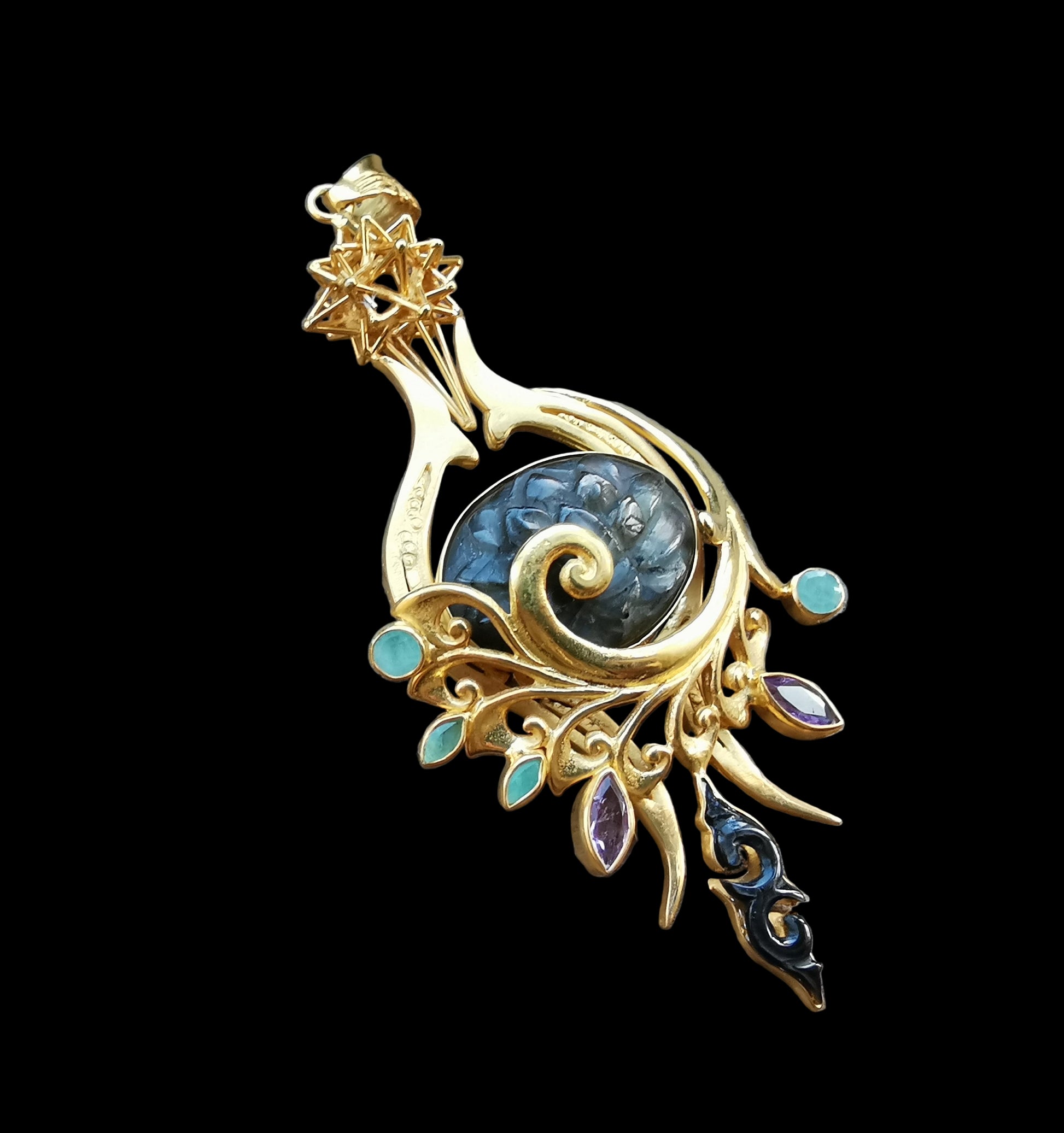 Ref.PD1132 - Gold plated on silver pendant with Star Light motif, mother of pearl decorations, labradorite carved lotus flower, emerald, and amethyst gemstone.