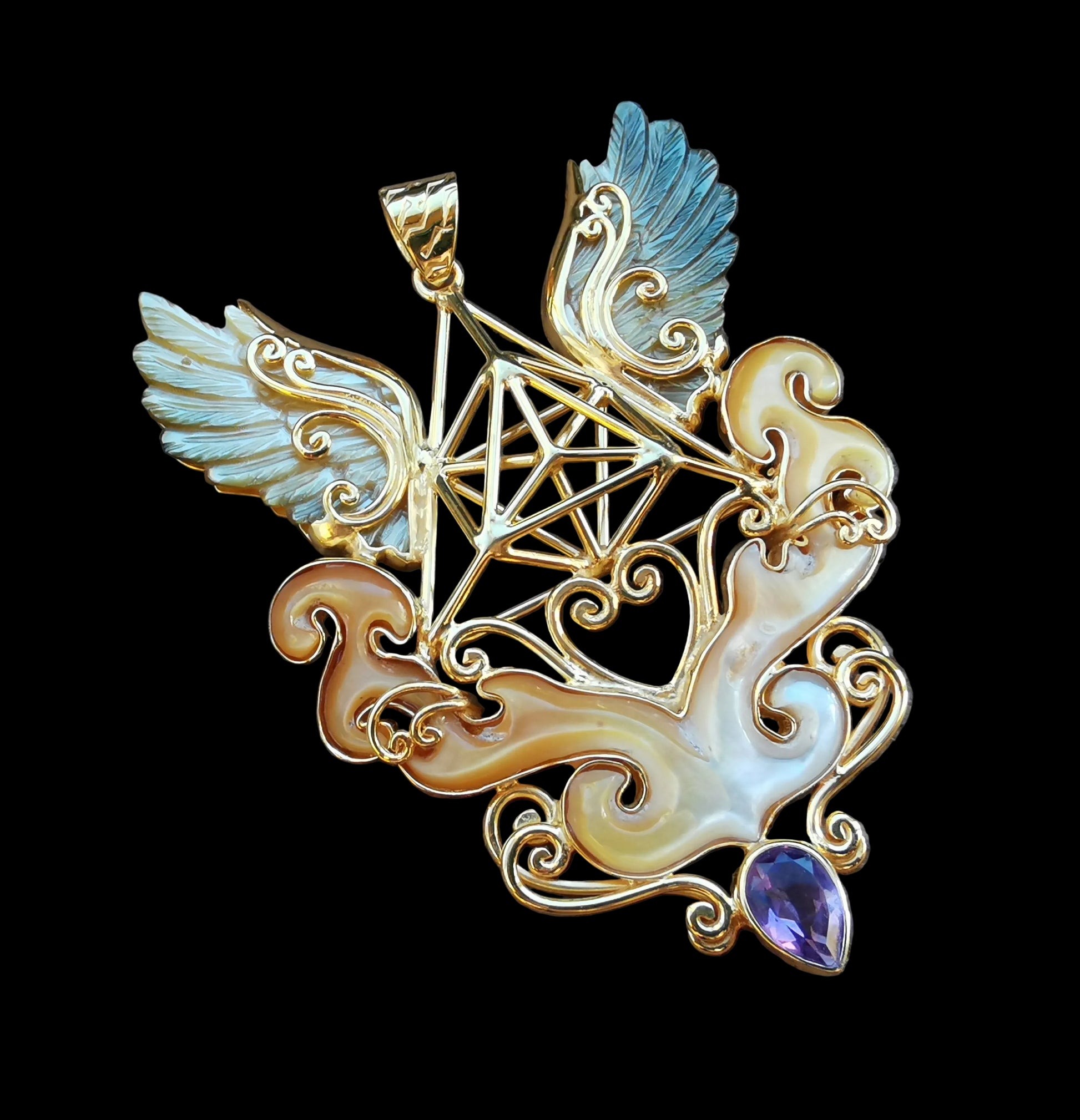 Ref.PD1122 - Gold plated on silver pendant with Tetra Prana geometry, mother of pearl carved wings & clouds, and amethyst gem.
