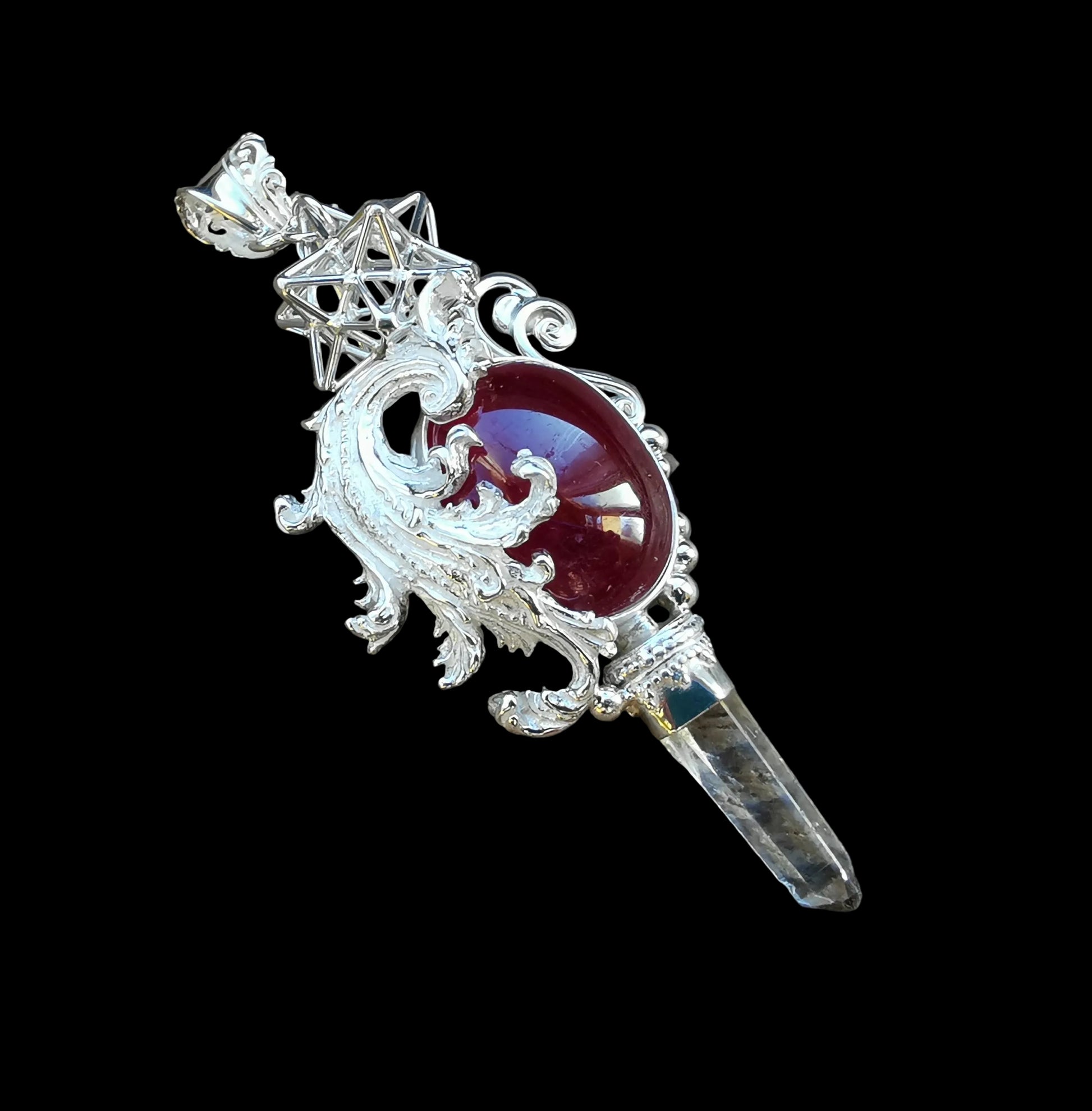 Ref.PD1138 - Silver pendant with Solar Star geometry, clear quartz crystal, and ruby gem.