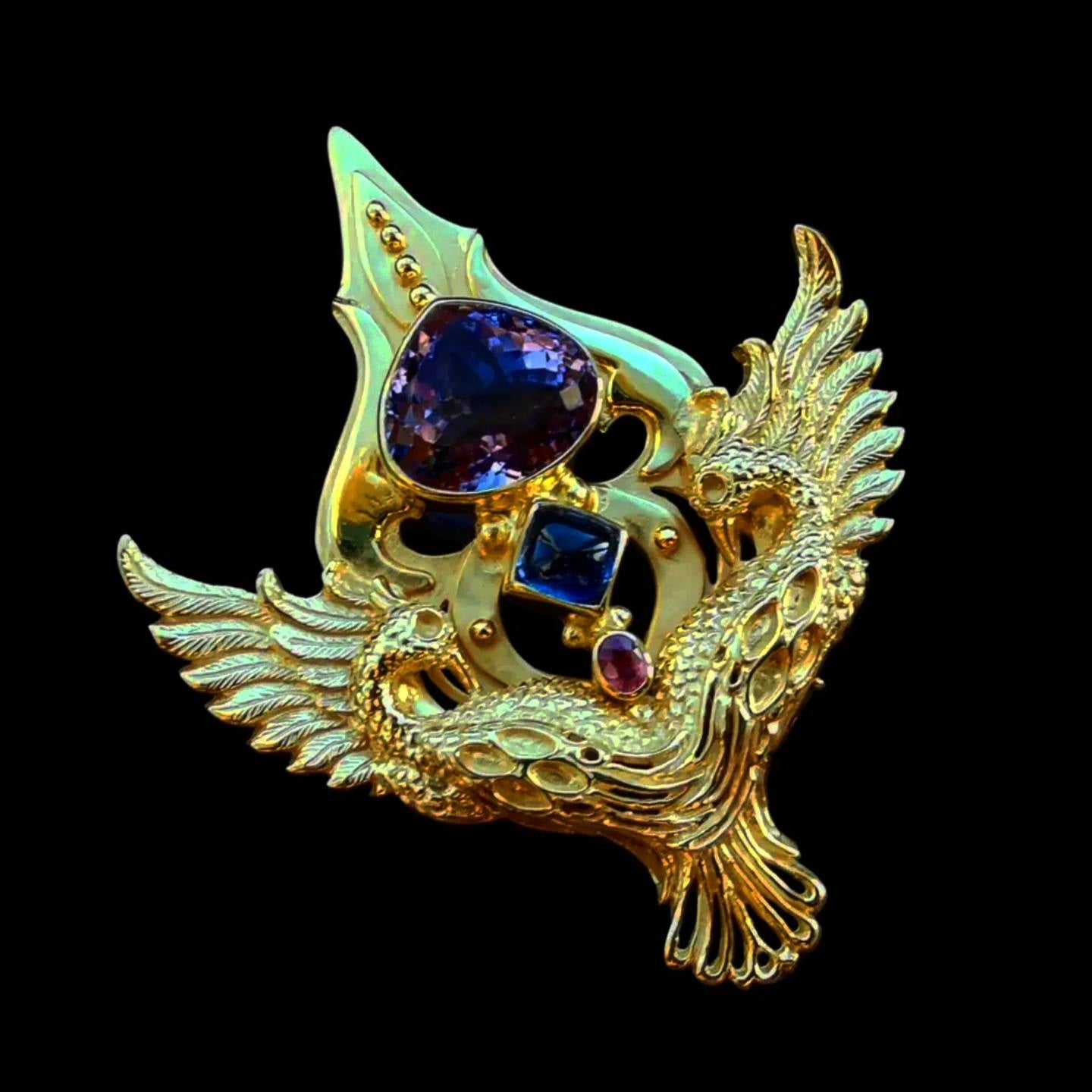 Ref.PD1140 - Gold plated on silver pendant with peacocks motif, ametrine, sapphire, and tourmaline gems.