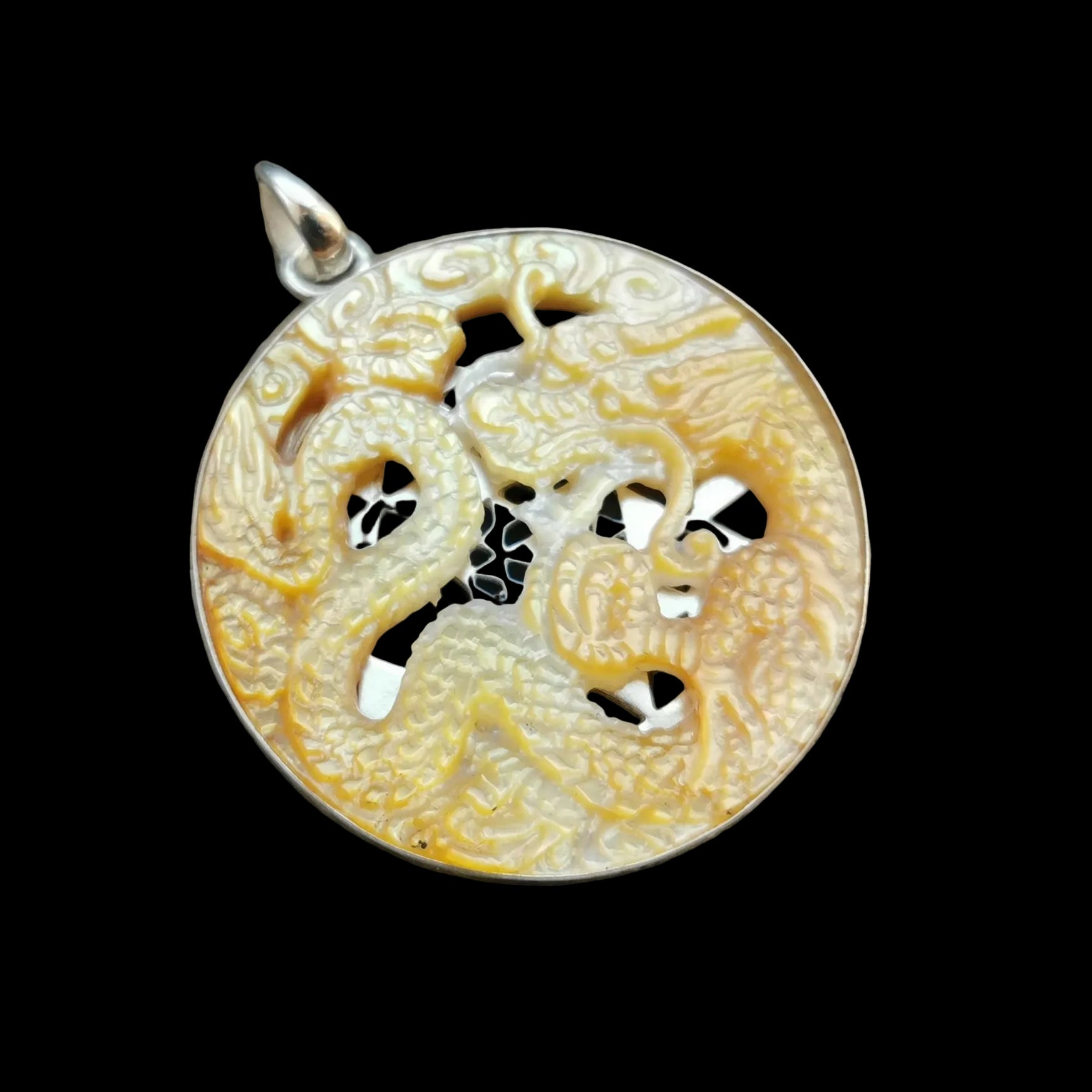 Ref.PD1143 - Double sided medallion with mother of pearl carved dragon & silver Sri Yantra geometry.