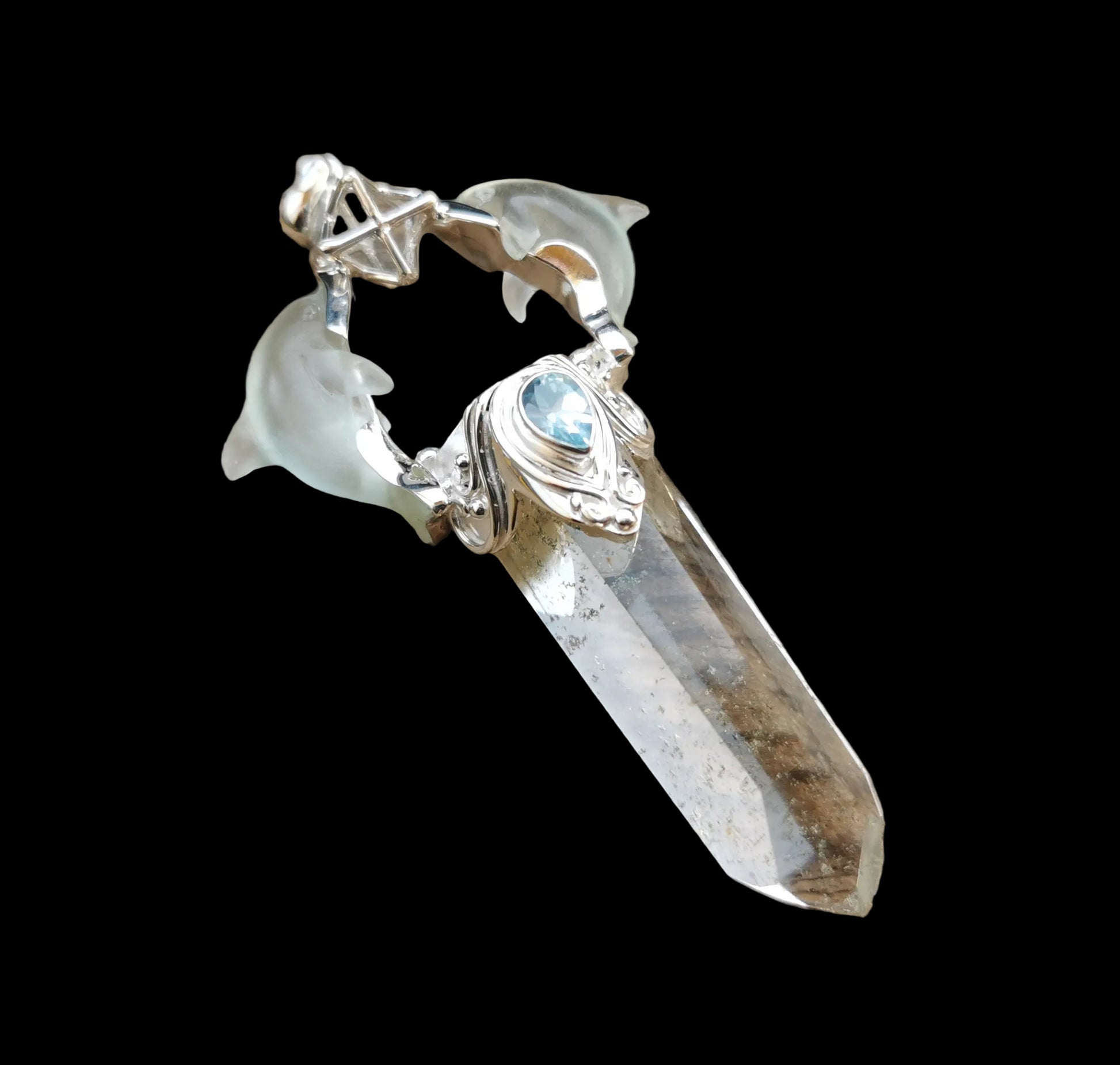 Ref.PD1146 - Silver pendant with Star Tetrahedron geometry, clear quartz crystal, dolphins, and sky blue topaz gem.