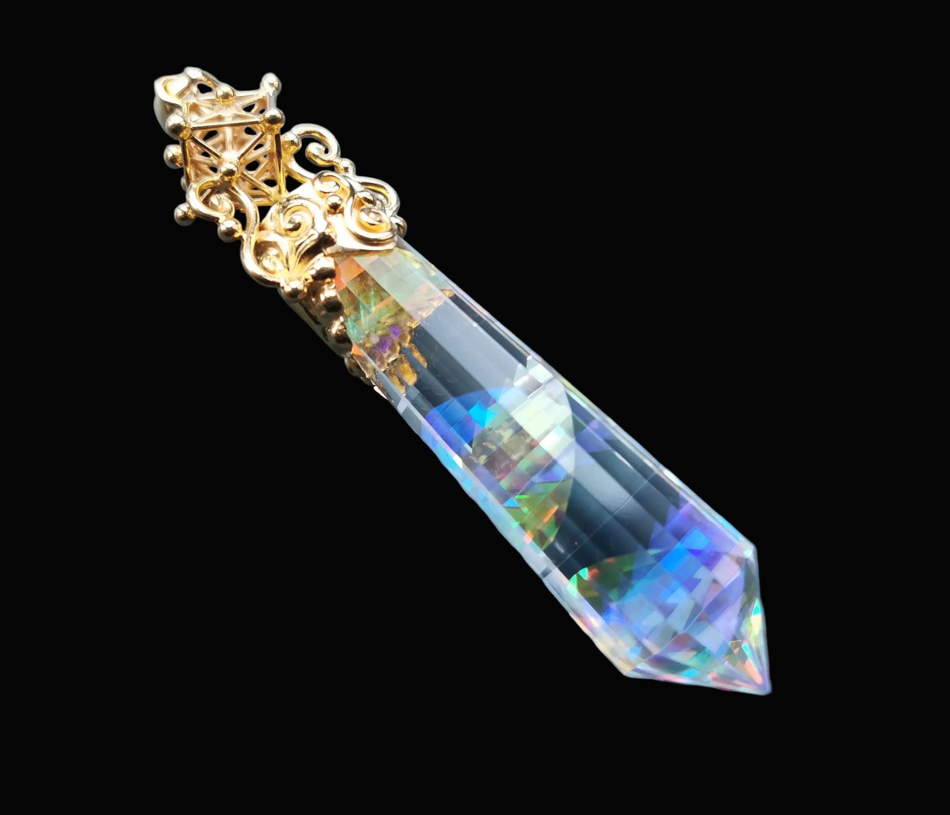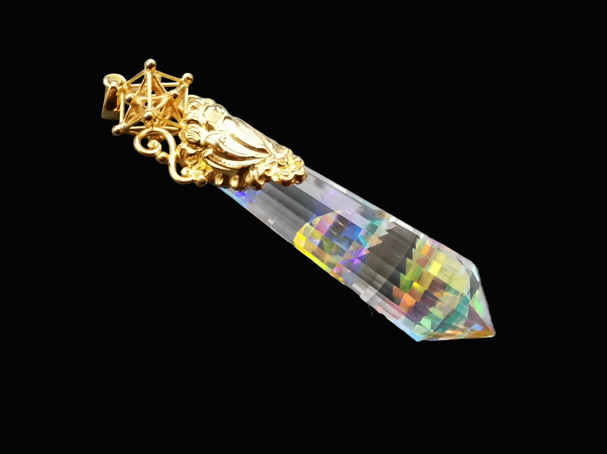 Ref.PD1149 - Gold plated on silver pendant with 3D Metatron Cube geometry, and mystic quartz crystal.