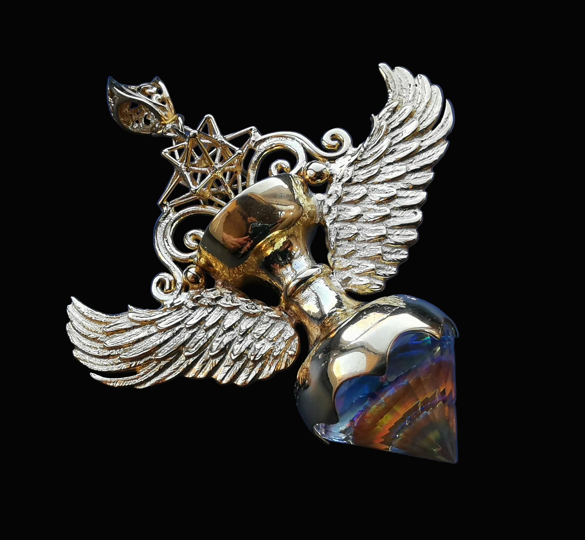 Ref.PD1161 - Gold plated on silver pendant with Heart Star geometry & wings, and mystic quartz crystal, depicting a chalice.