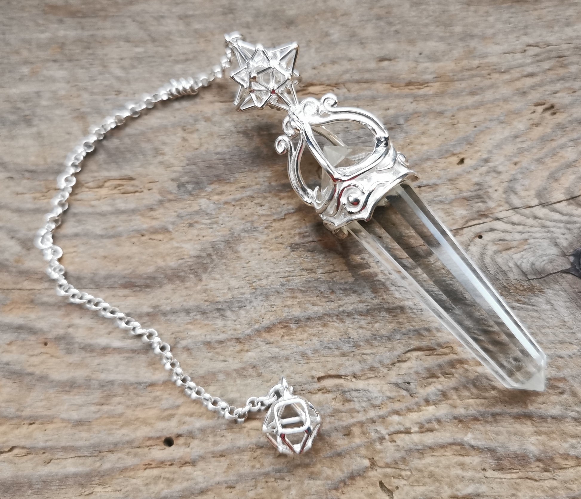 Ref.PU0004 - Silver pendulum with Heart Star & Iconic Terra Prana Sphere geometries, and 12 sided vogel quartz crystal.