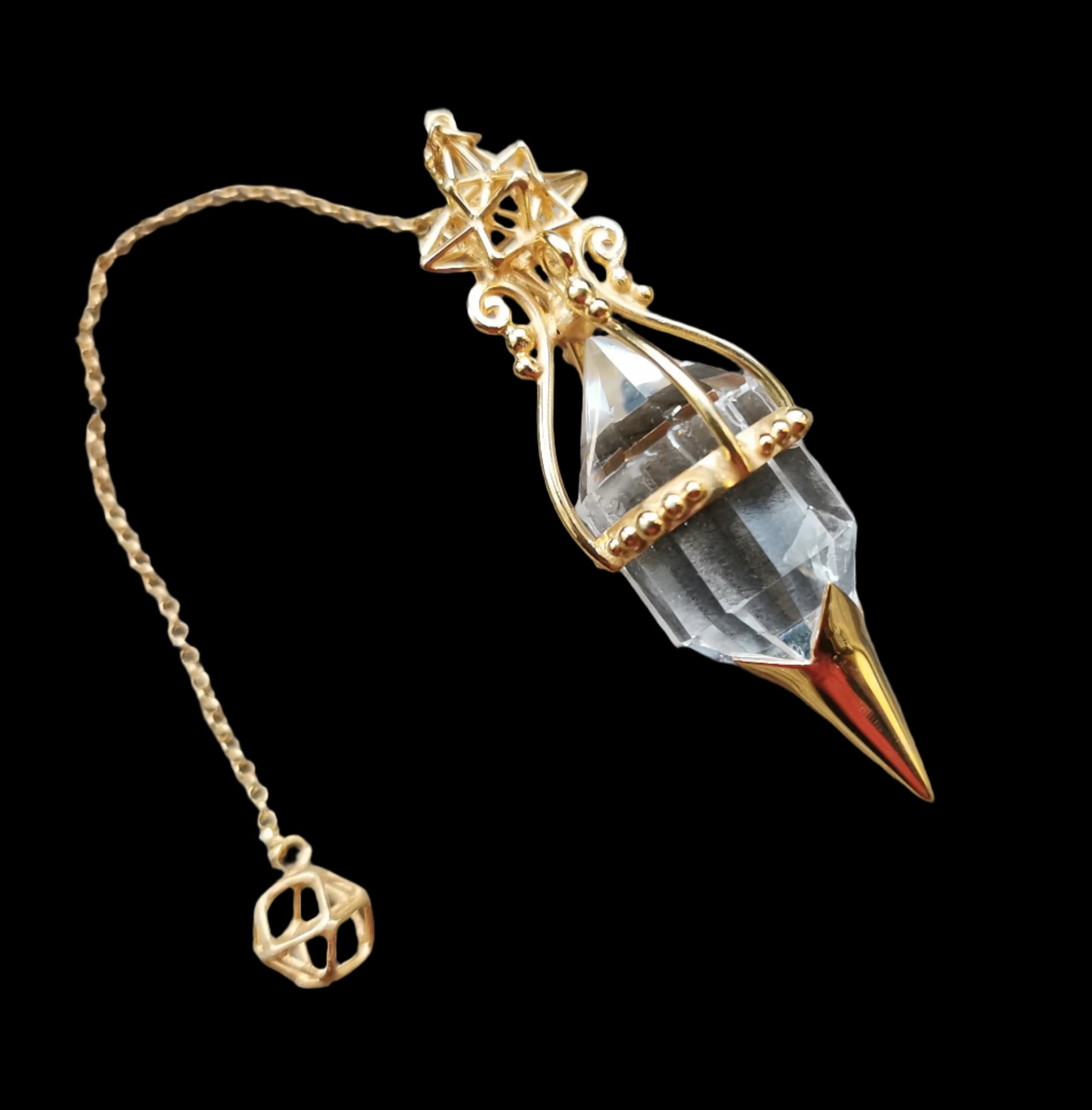 Ref.PU0006 - Gold plated on silver pendulum with Heart Star & Iconic Terra Prana Sphere geometries, and 12 sided vogel quartz crystal.