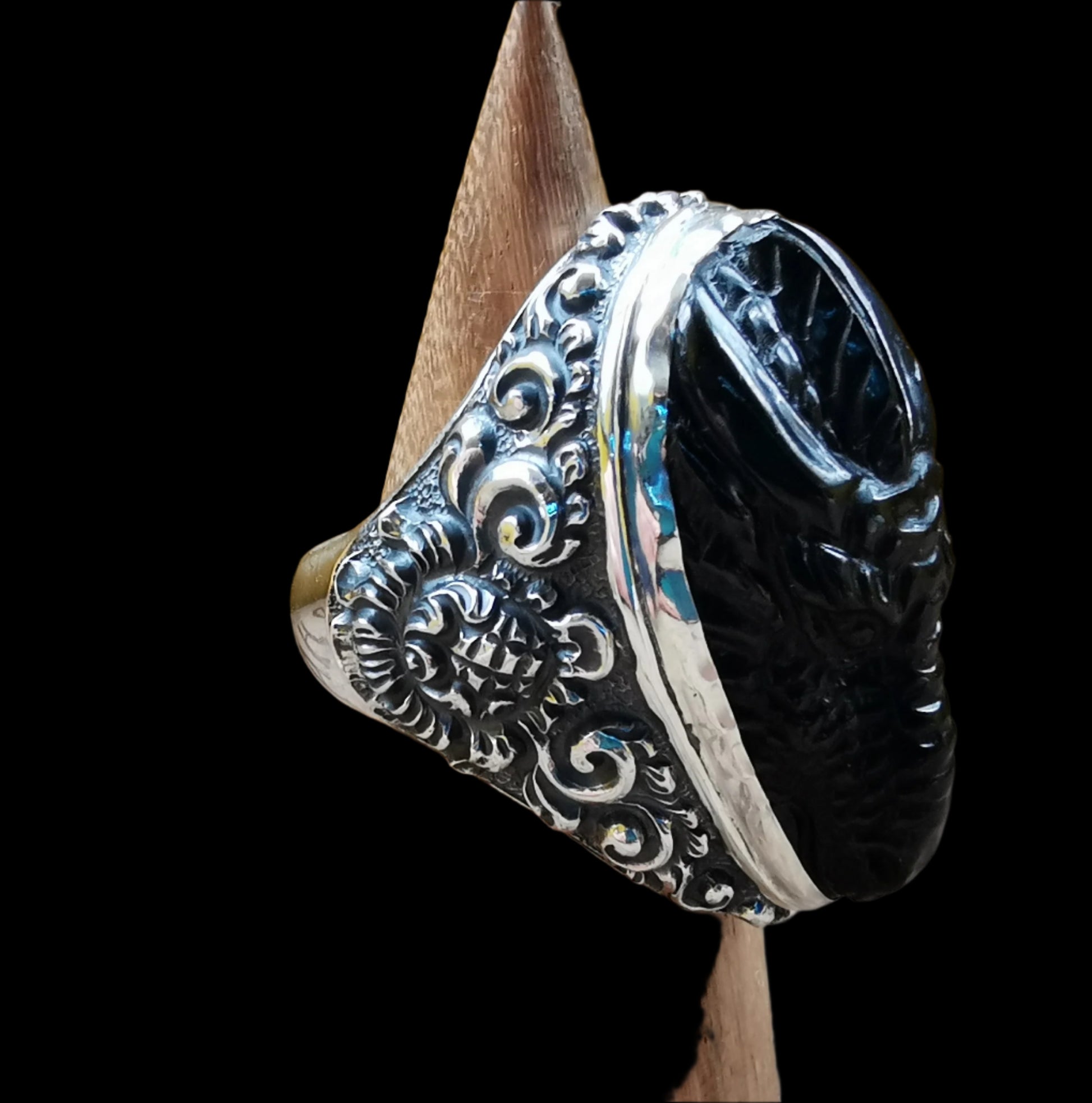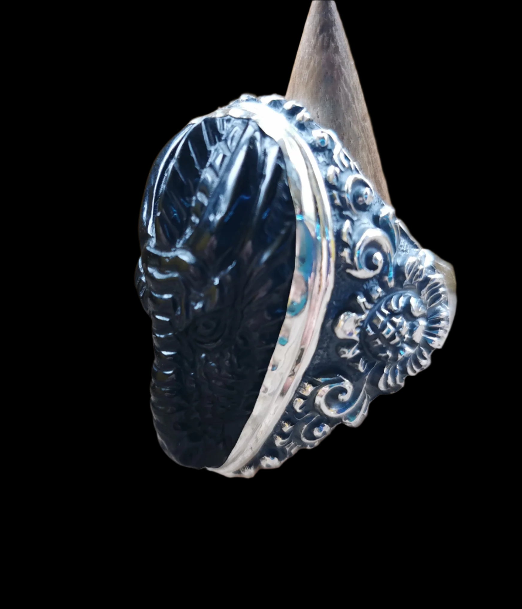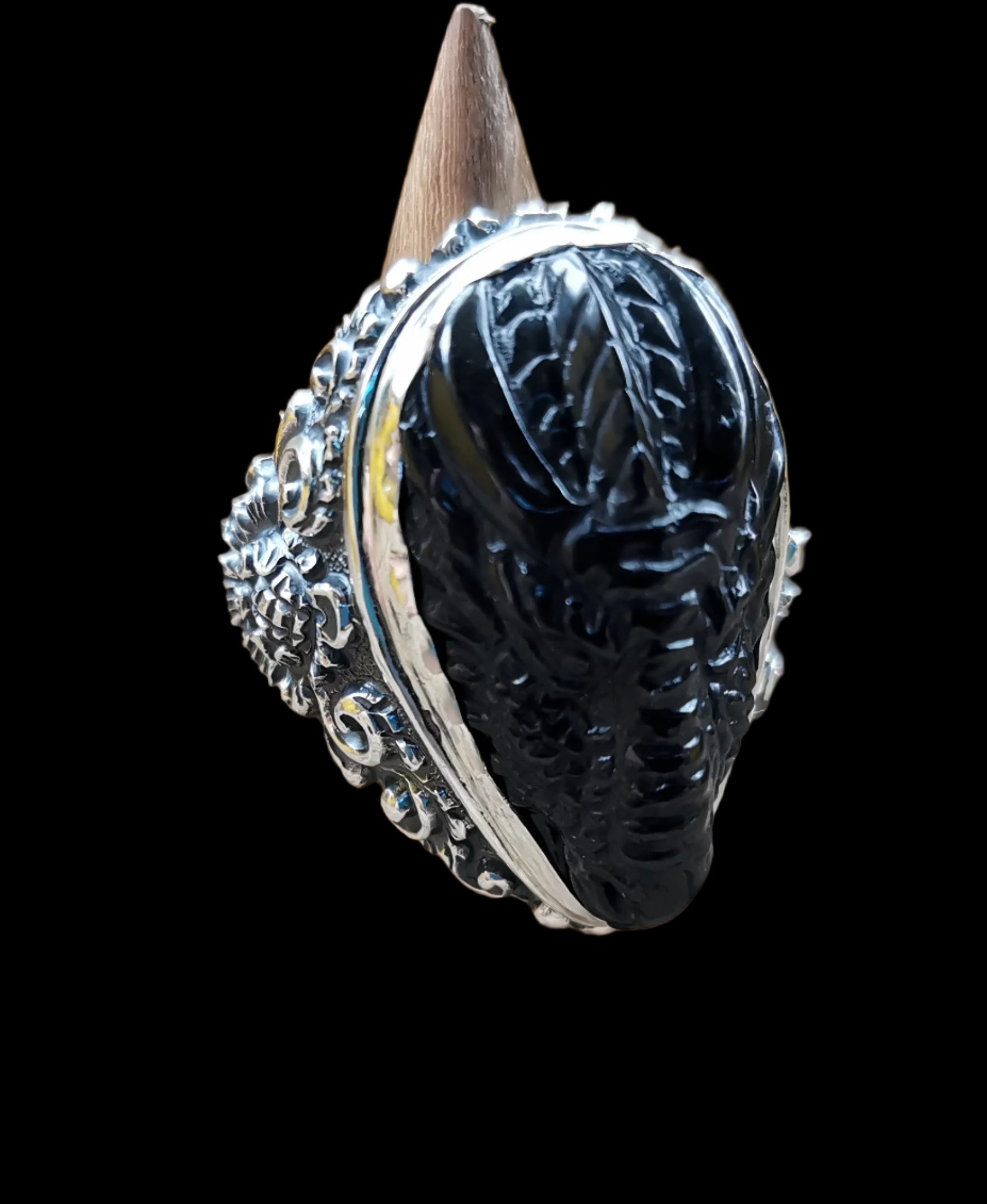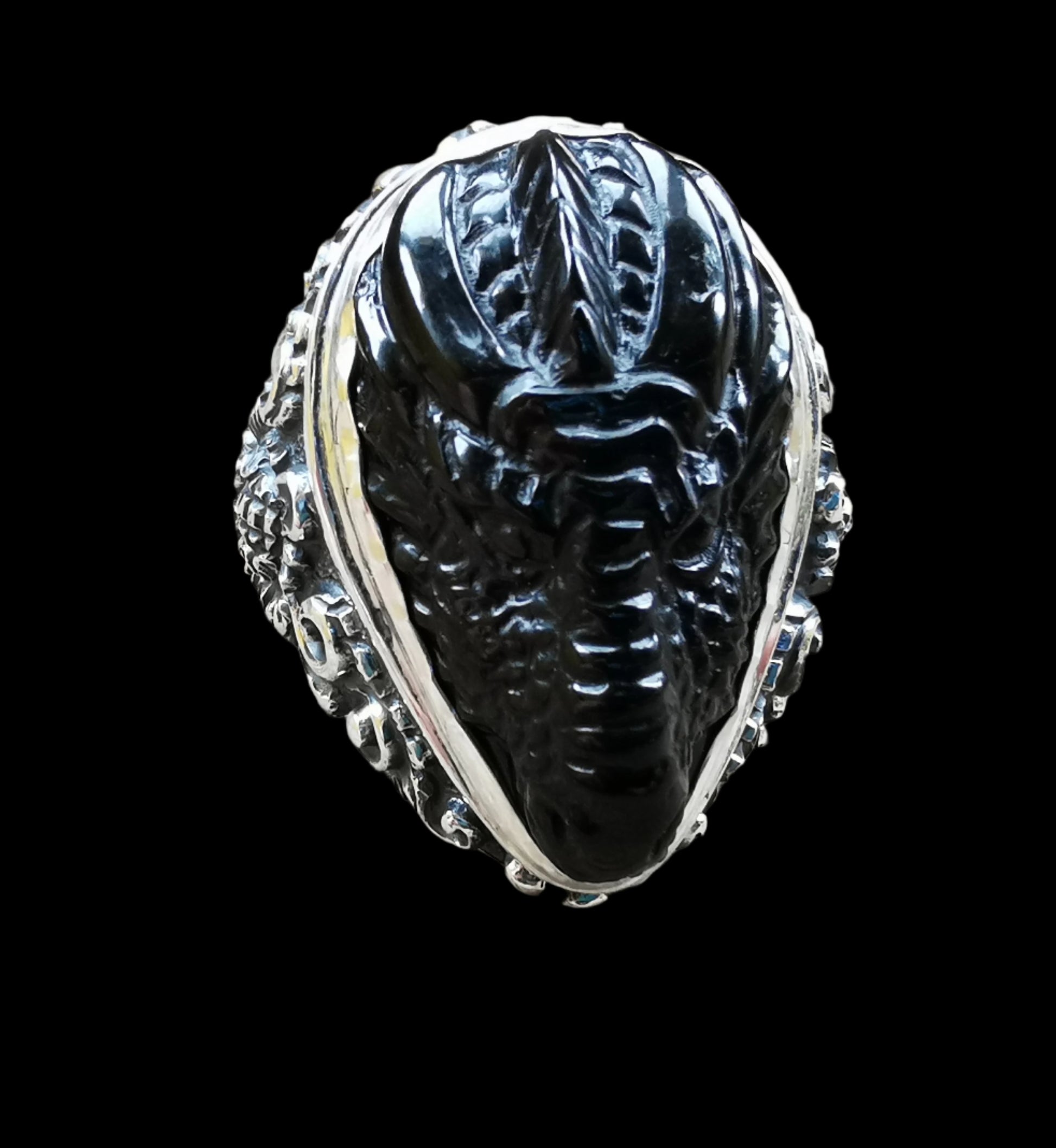 Ref.RG0154 - Silver repoussé ring with obsidian gem carved dragon head.