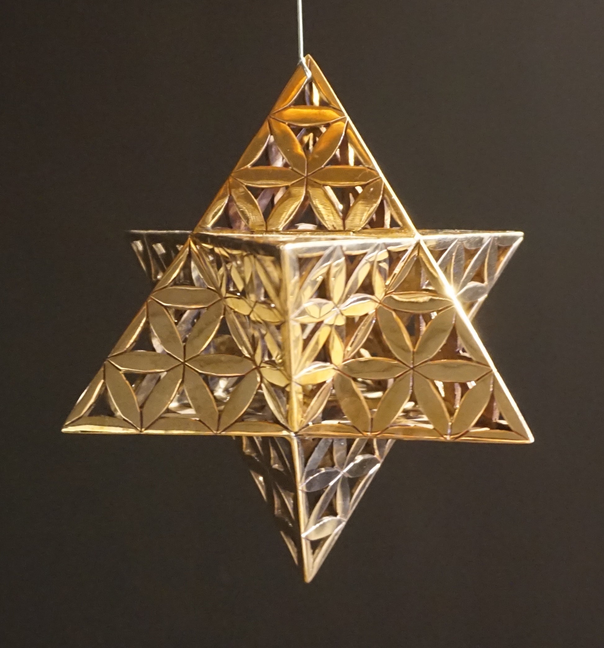 The Tantric Star is formed by interlocking ascending and descending tetrahedrons (see Tetrahedron). Also known as the Mer Ka Ba, the Tantric Star functions as a 3-dimensional mandala, connecting us to our centre point, a stargate into the matrix of manifest reality. It describes the energy pattern created by the electromagnetic male and female potencies of creation as they come together to conceive atoms, Humans, the Universe - the seminal form that Consciousness takes as it initiates the polarisation of the Monad into the sacred enclosure of the Trinity, holding the frequency of the 3rd dimension fully manifest in form.