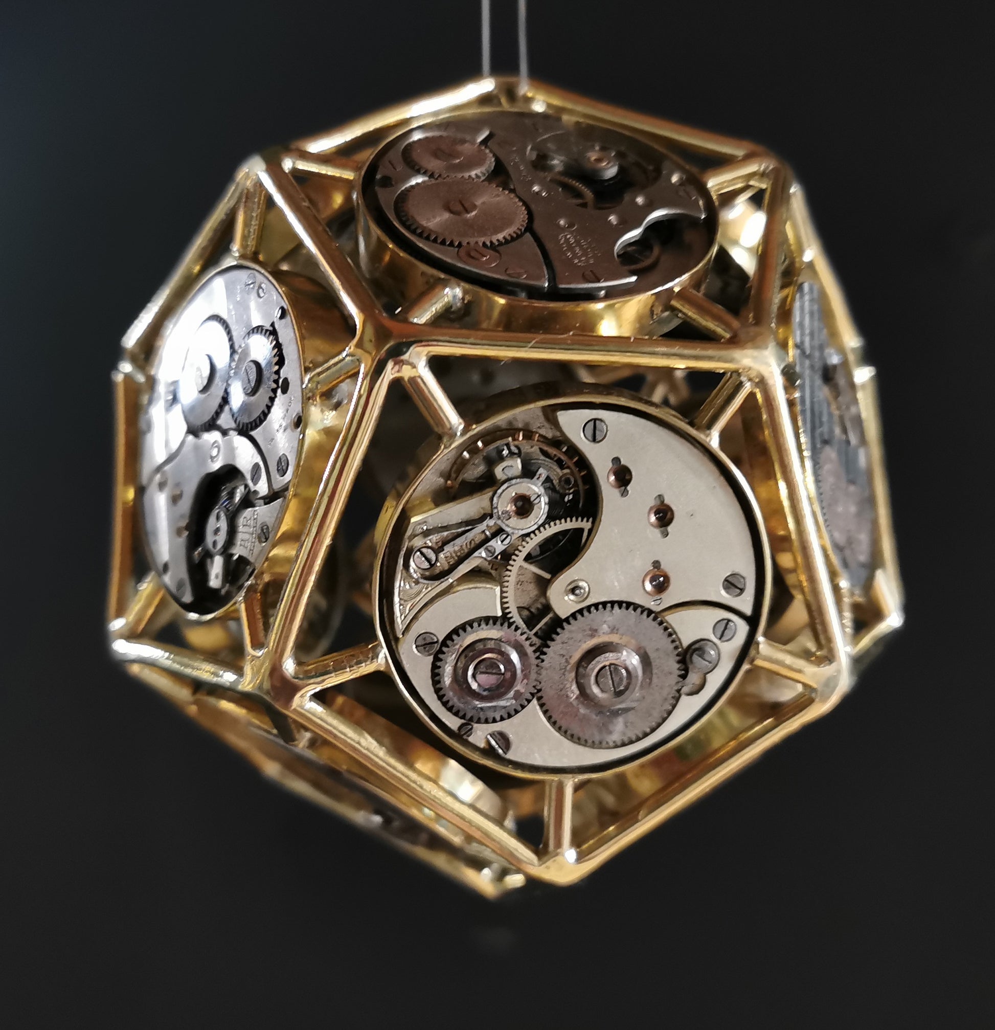 One of the five Platonic solids, and symbolizing Ether, the dodecahedron has twenty vertices and twelve pentagonal faces with three faces meeting.
