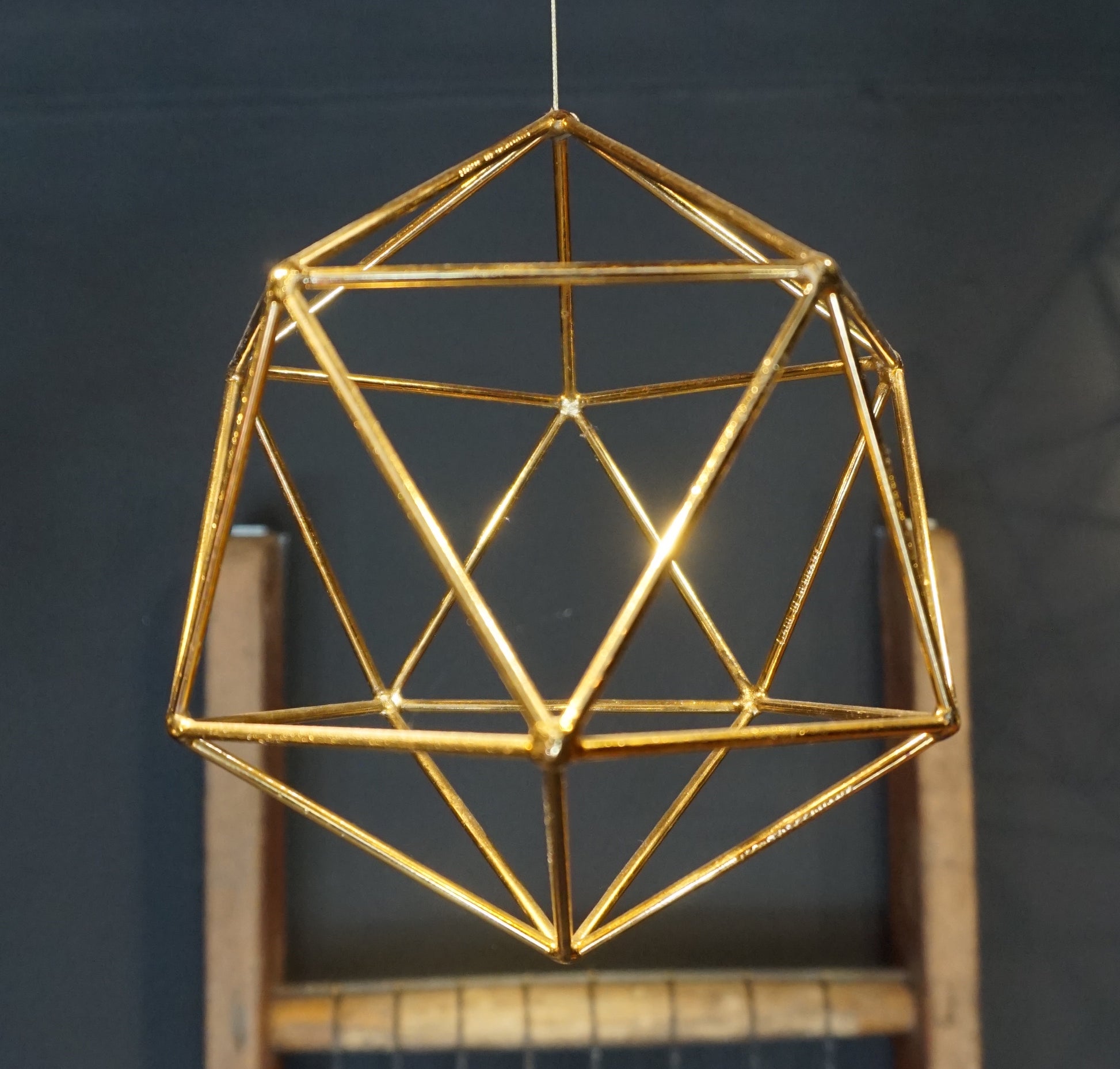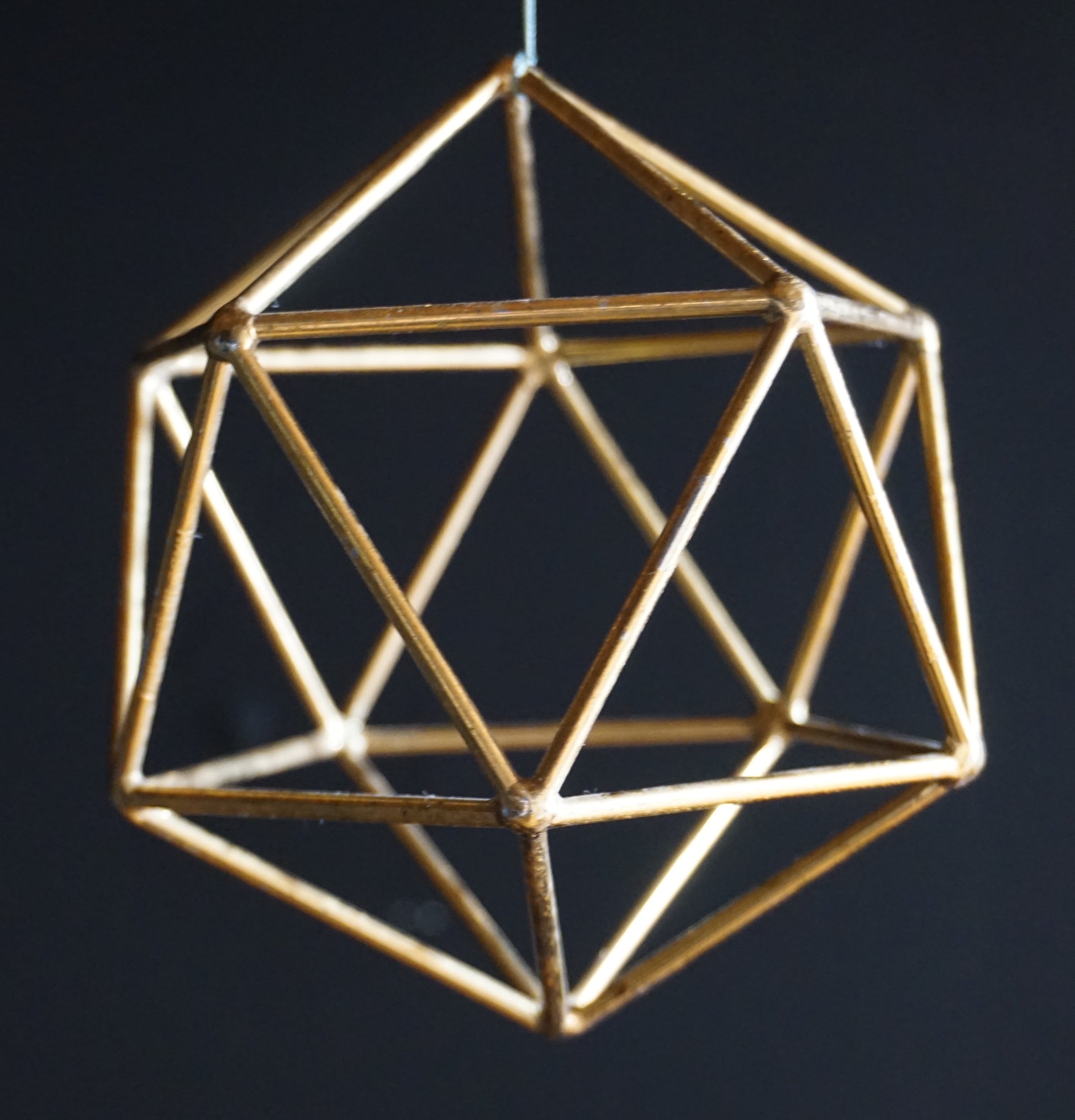 The icosahedron is the last of the 5 platonic solids. It has twelve vertices and twenty triangular faces with five faces meeting. It symbolizes the element of Water