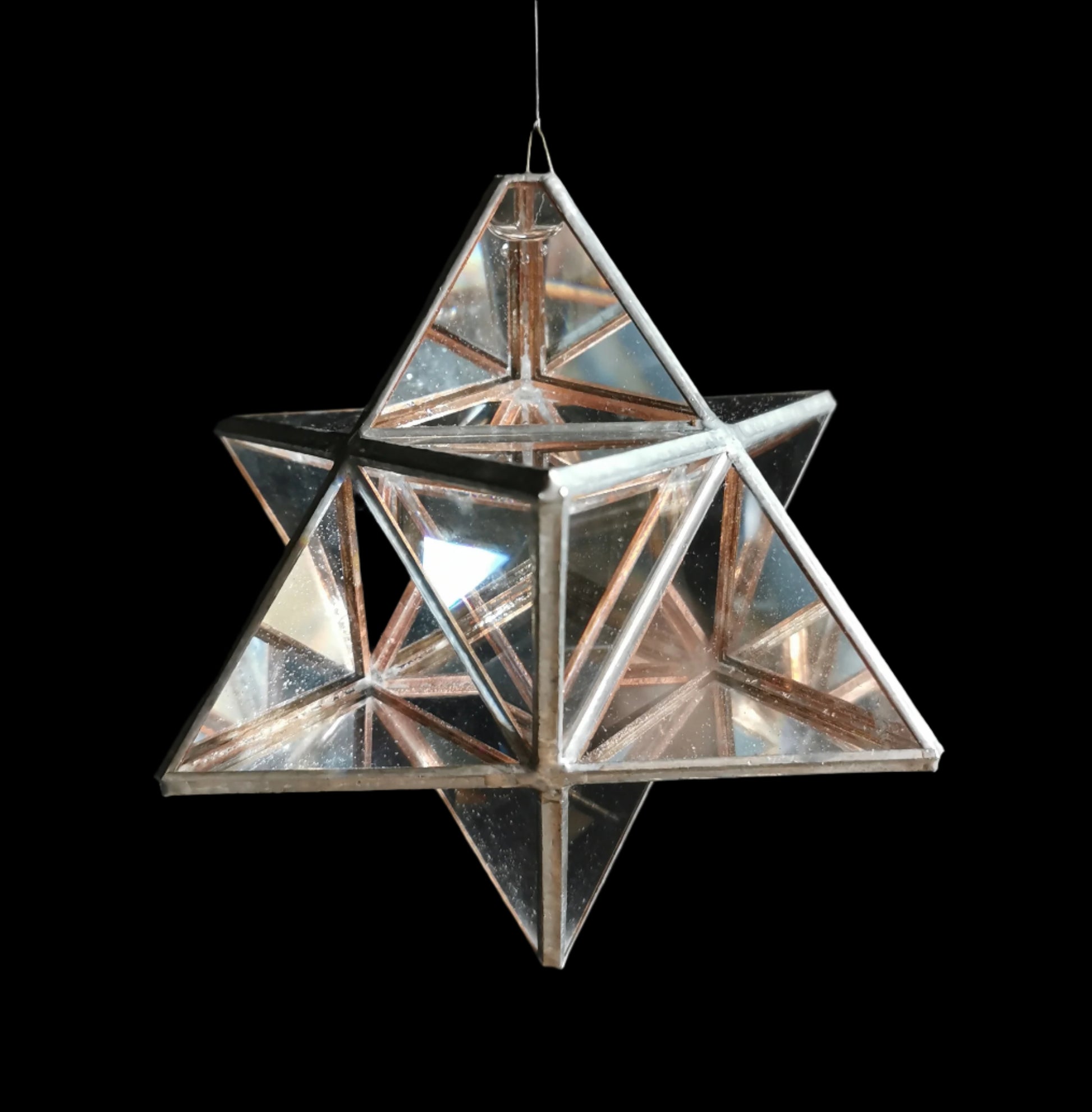The Tantric Star is formed by interlocking ascending and descending tetrahedrons (see Tetrahedron). Also known as the Mer Ka Ba, the Tantric Star functions as a 3-dimensional mandala, connecting us to our centre point, a stargate into the matrix of manifest reality. It describes the energy pattern created by the electromagnetic male and female potencies of creation as they come together to conceive atoms, Humans, the Universe - the seminal form that Consciousness takes as it initiates the polarisation of the Monad into the sacred enclosure of the Trinity, holding the frequency of the 3rd dimension fully manifest in form.