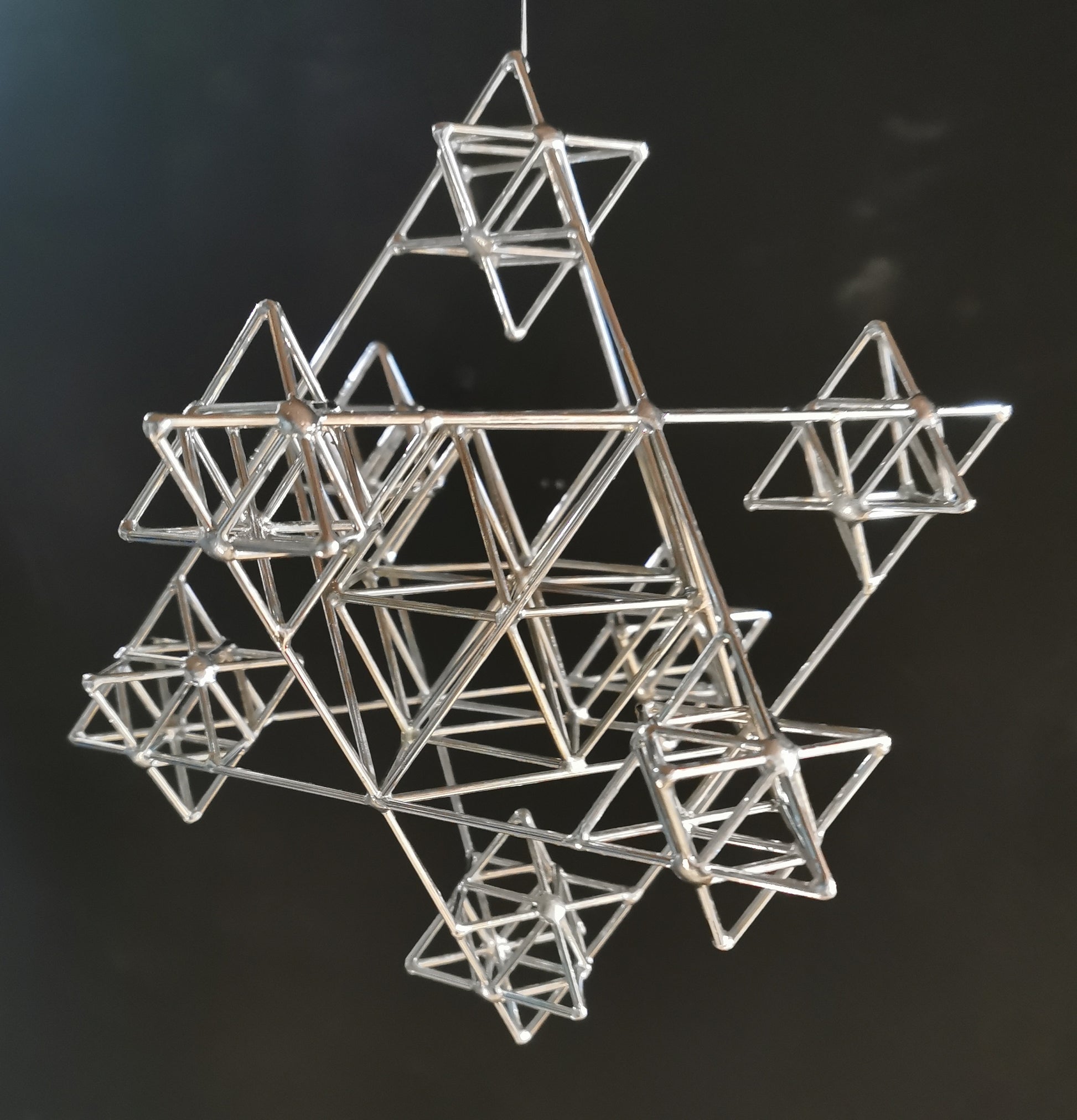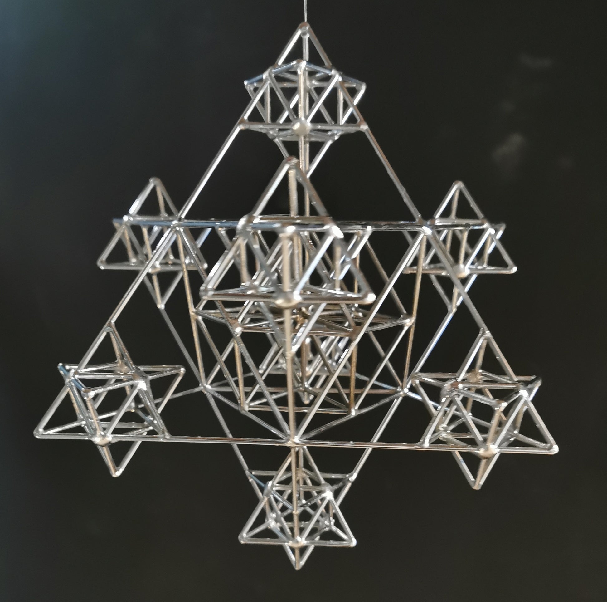 The Tantric Star is formed by interlocking ascending and descending tetrahedrons (see Tetrahedron). Also known as the Mer Ka Ba, the Tantric Star functions as a 3-dimensional mandala, connecting us to our centre point, a stargate into the matrix of manifest reality. It describes the energy pattern created by the electromagnetic male and female potencies of creation as they come together to conceive atoms, Humans, the Universe - the seminal form that Consciousness takes as it initiates the polarisation of the Monad into the sacred enclosure of the Trinity, holding the frequency of the 3rd dimension fully manifest in form.