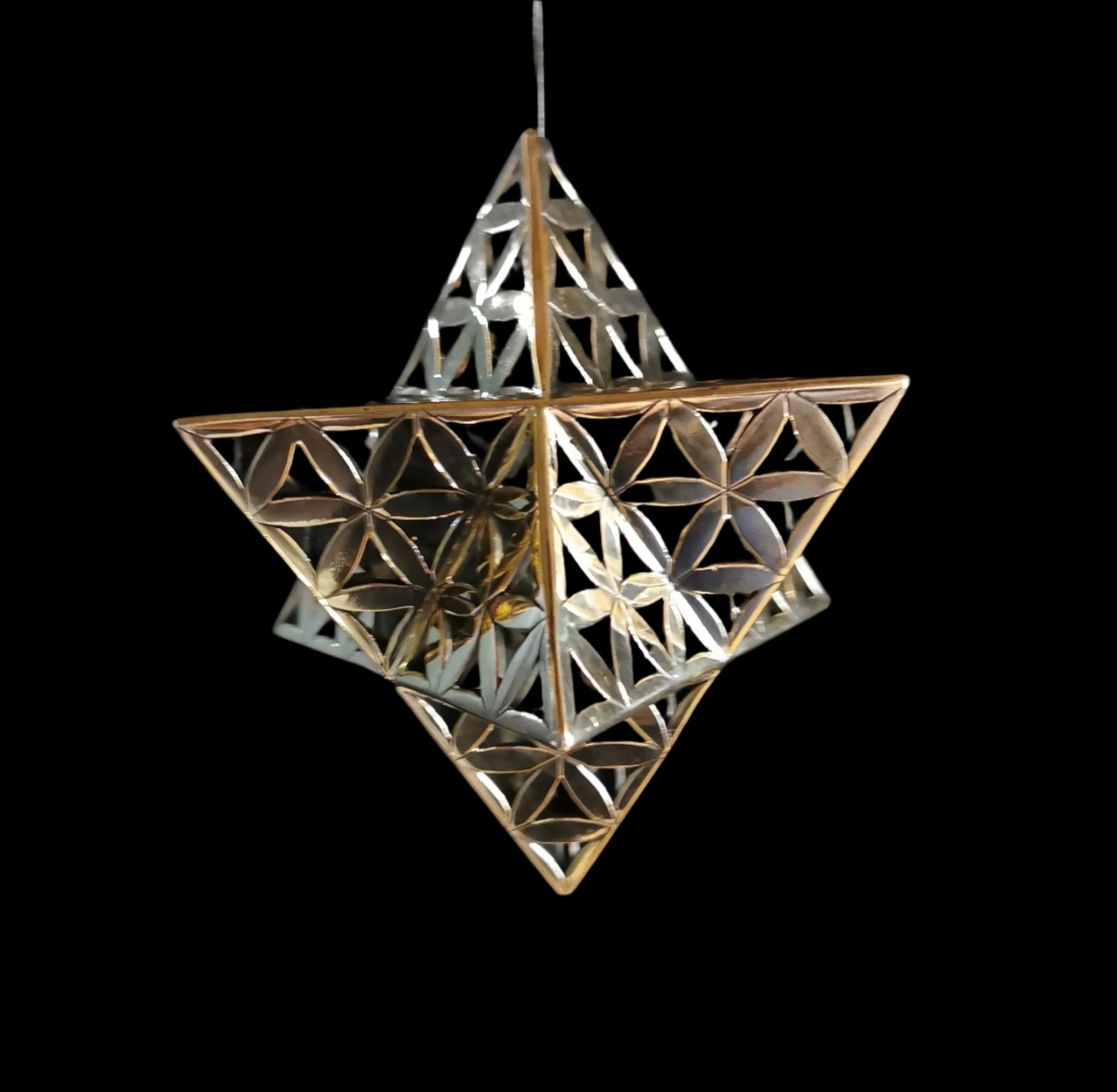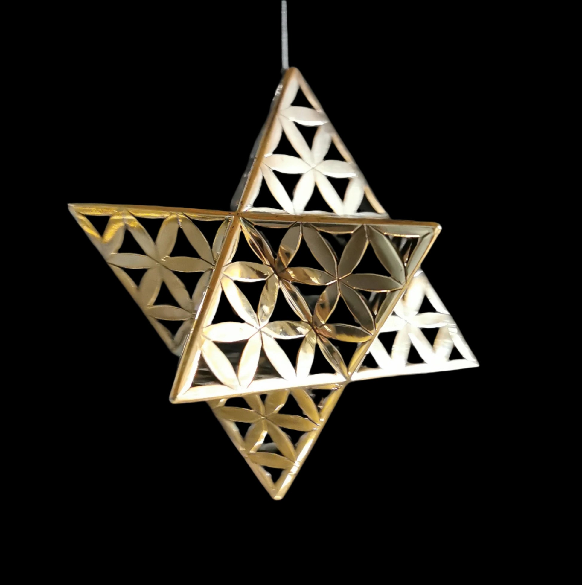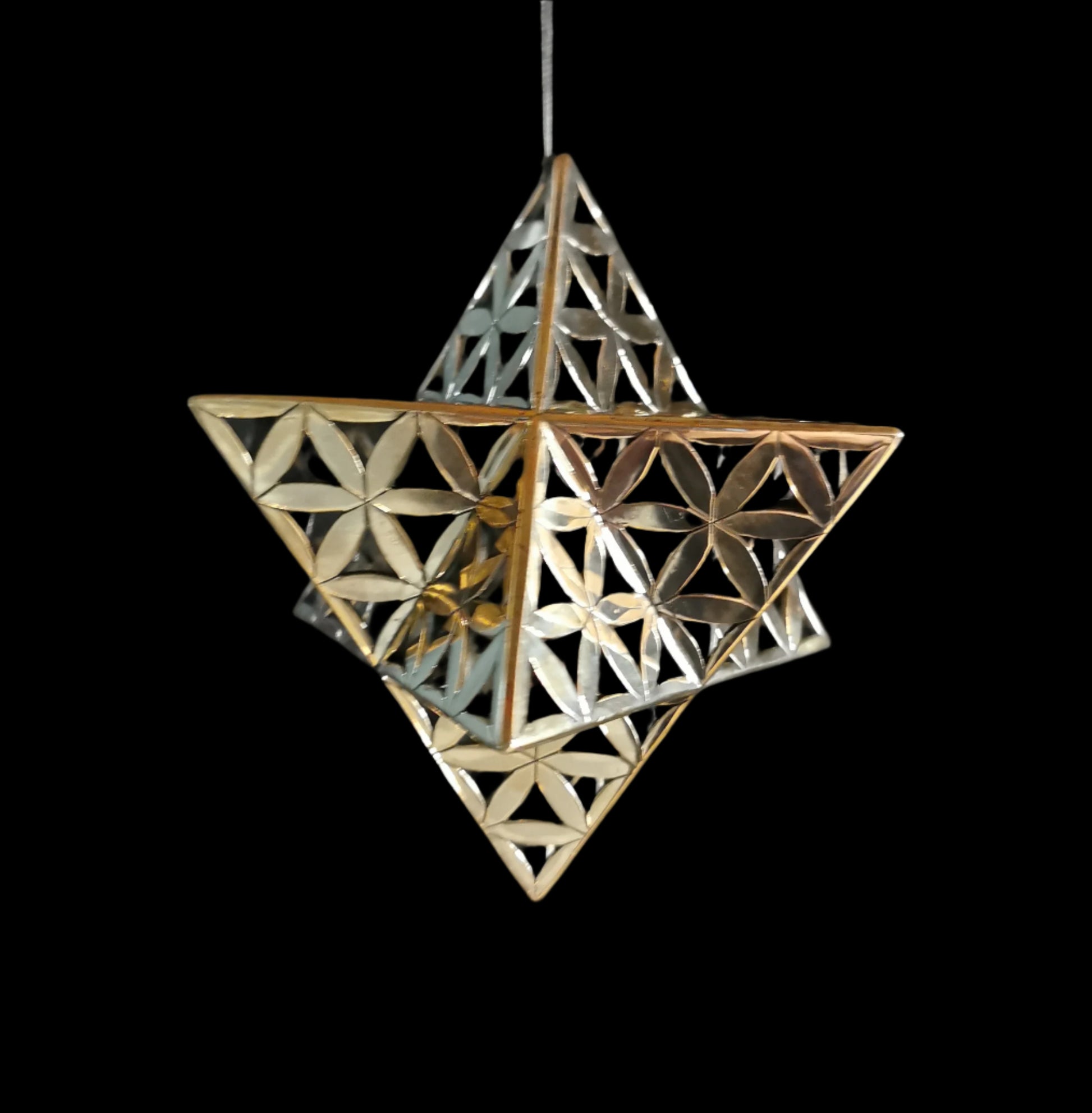 The Tantric Star is formed by interlocking ascending and descending tetrahedrons (see Tetrahedron). Also known as the Mer Ka Ba, the Tantric Star functions as a 3-dimensional mandala, connecting us to our centre point, a stargate into the matrix of manifest reality. It describes the energy pattern created by the electromagnetic male and female potencies of creation as they come together to conceive atoms, Humans, the Universe - the seminal form that Consciousness takes as it initiates the polarisation of the Monad into the sacred enclosure of the Trinity, holding the frequency of the 3rd dimension fully manifest in form.