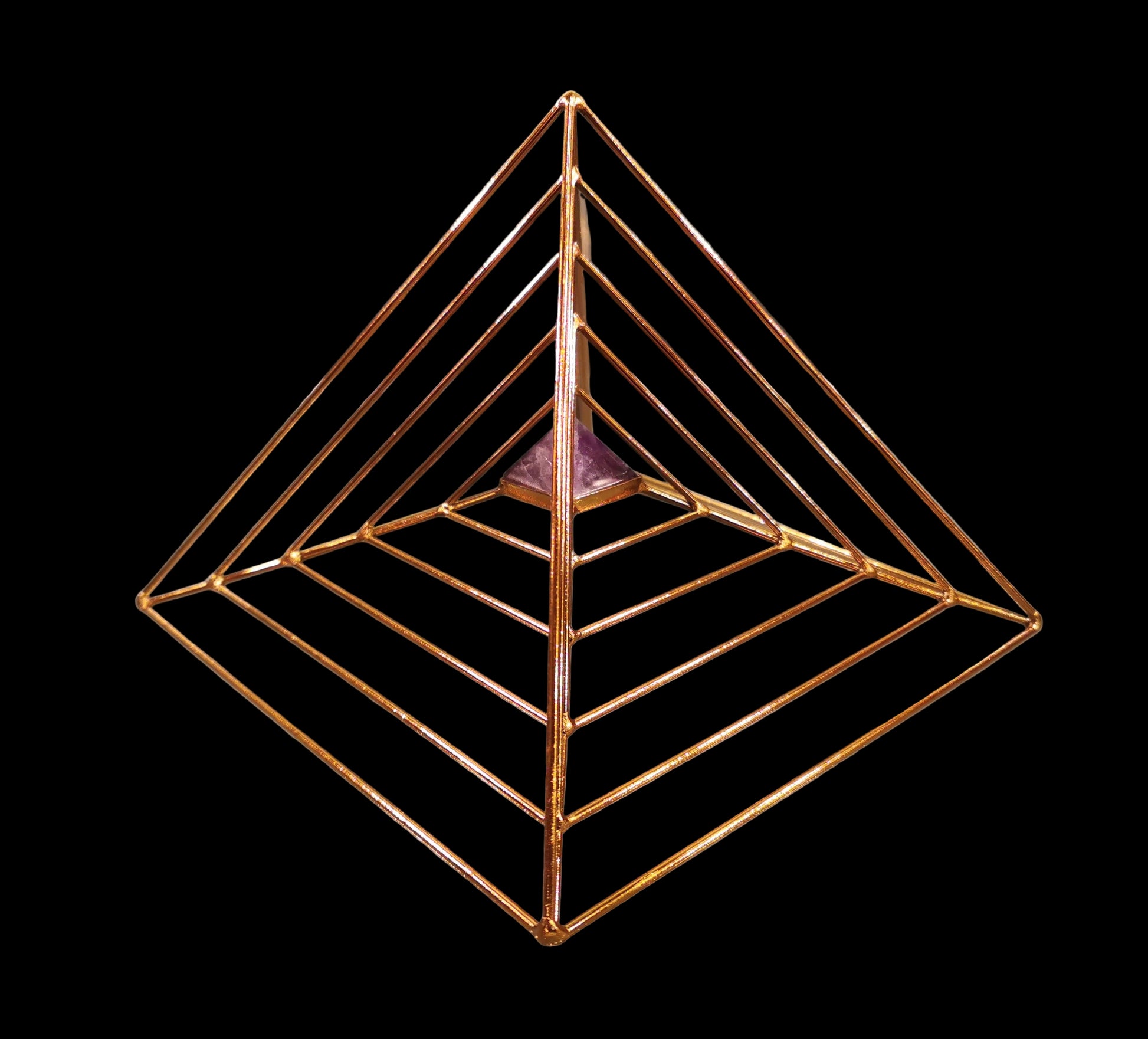 The tetrahedron is the simplest of all 3-dimensional geometric forms, the ‘seed’ of geometry, the first in a succession of the divisions of the sphere. It represents the element of Fire - creation and creativity, sexuality, procreation and desire, transmutation and transformation, the master purifier. In any of its forms or compounded matrices (Star Tetrahedron, Tantric Star, Hyper Tetrahedron), it is a gateway to our Self.