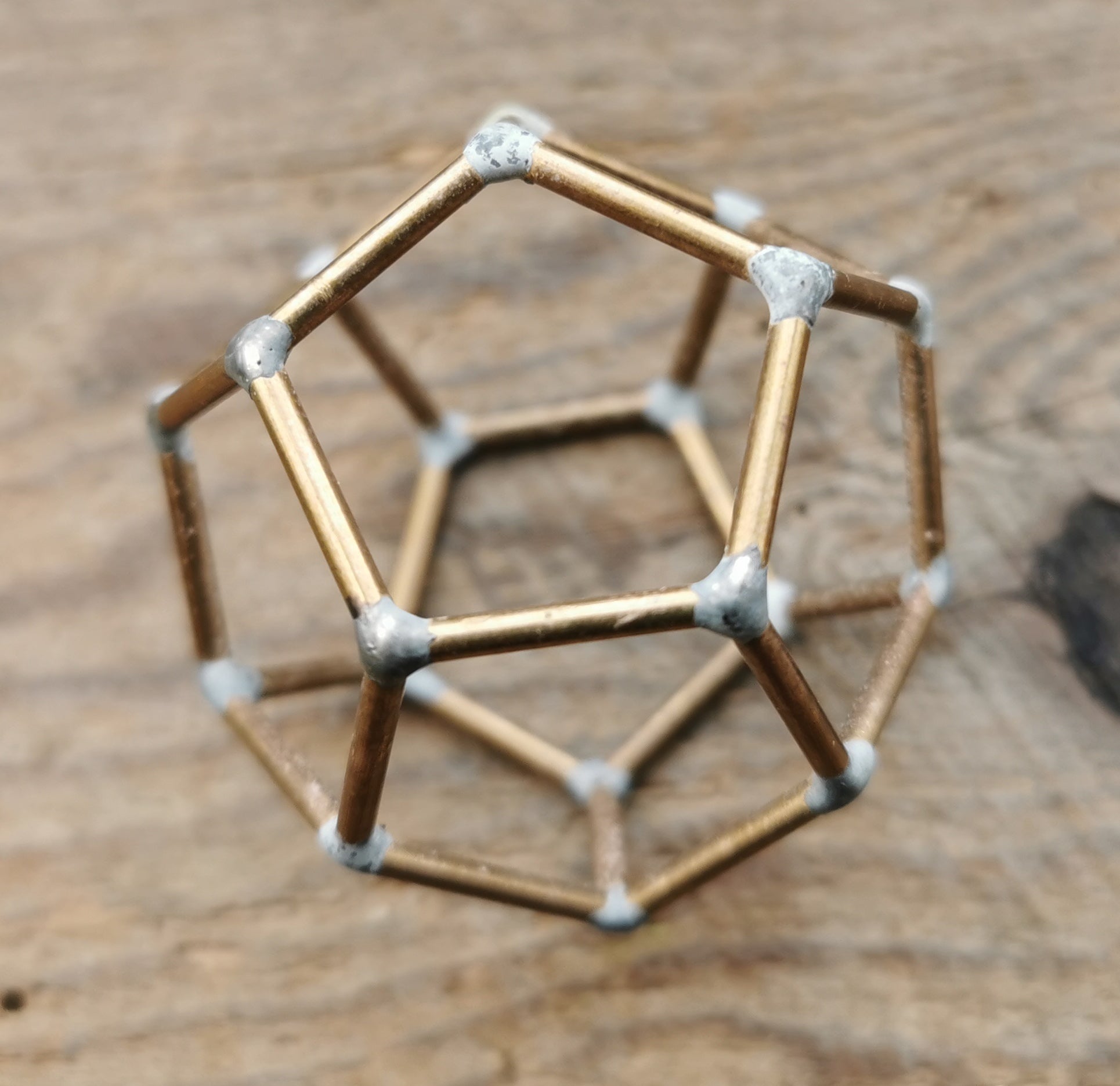 One of the five Platonic solids, and symbolizing Ether, the dodecahedron has twenty vertices and twelve pentagonal faces with three faces meeting.