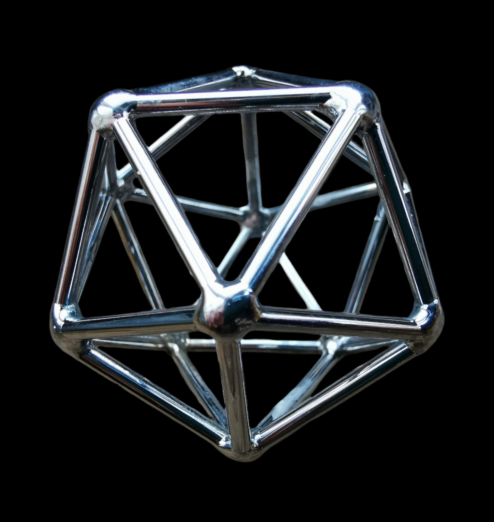 The icosahedron is the last of the 5 platonic solids. It has twelve vertices and twenty triangular faces with five faces meeting. It symbolizes the element of Water