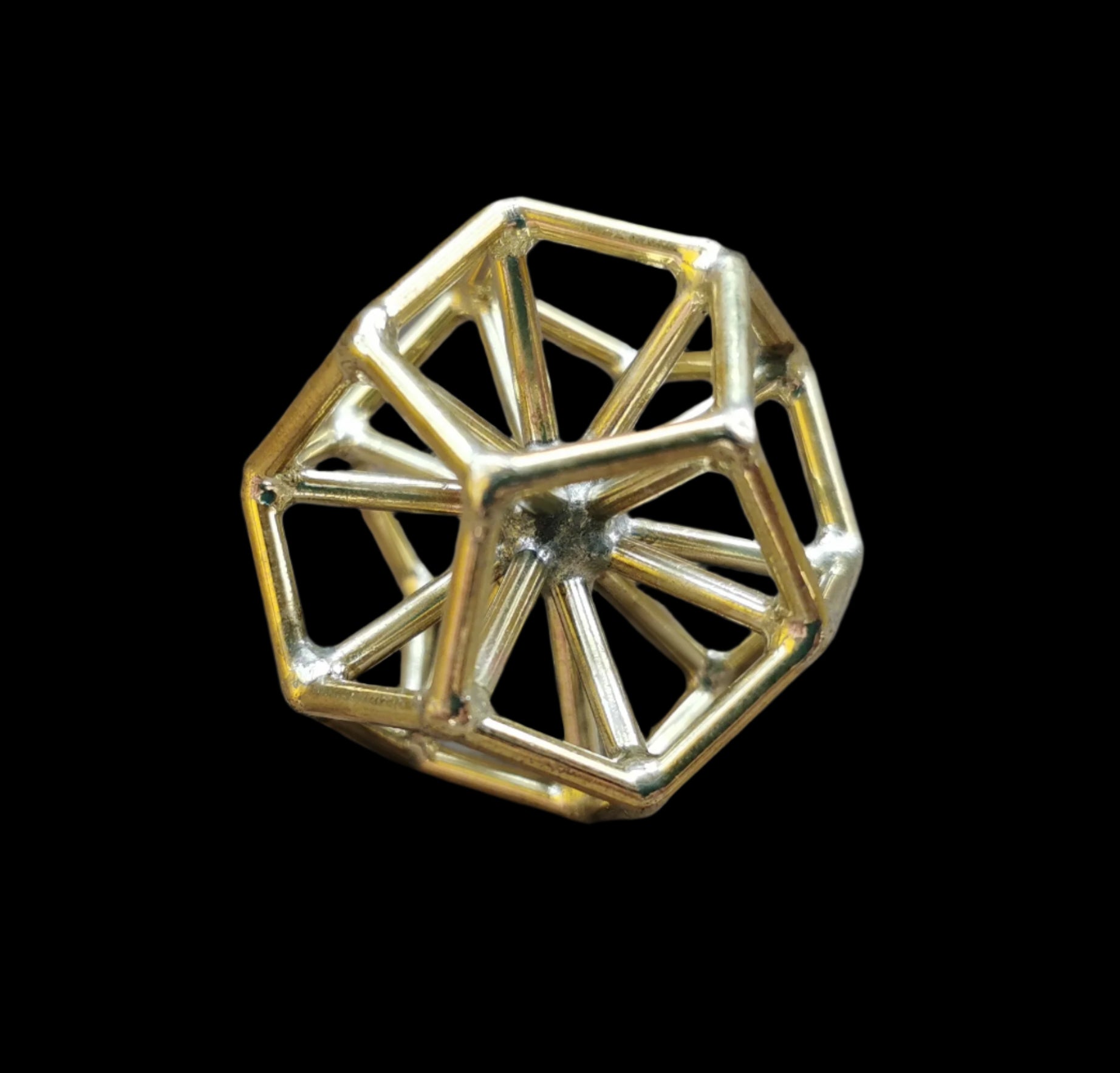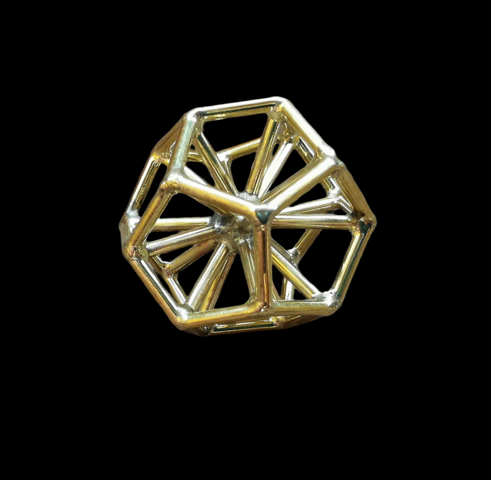 One of the five Platonic solids, and symbolizing Ether, the dodecahedron has twenty vertices and twelve pentagonal faces with three faces meeting.