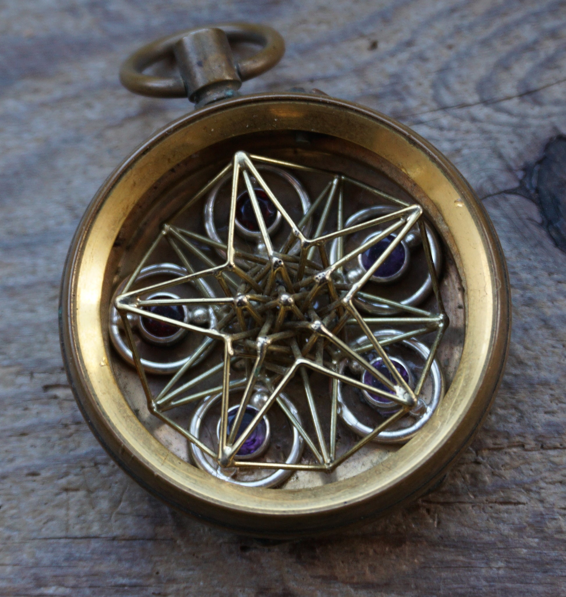 Ref.WA0003 - Old brass watch box with 5D Hyper Cube geometry, amethyst, and garnet gemstones.