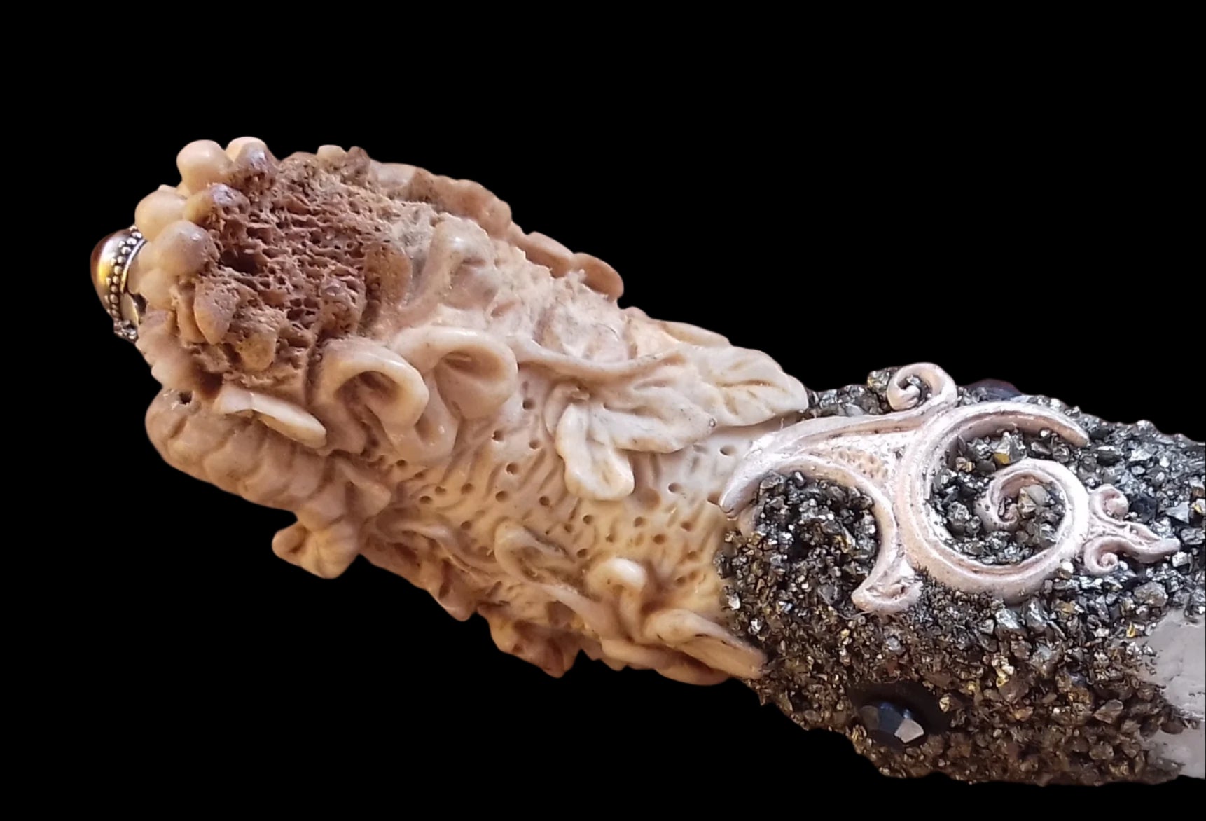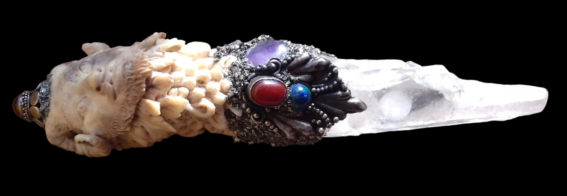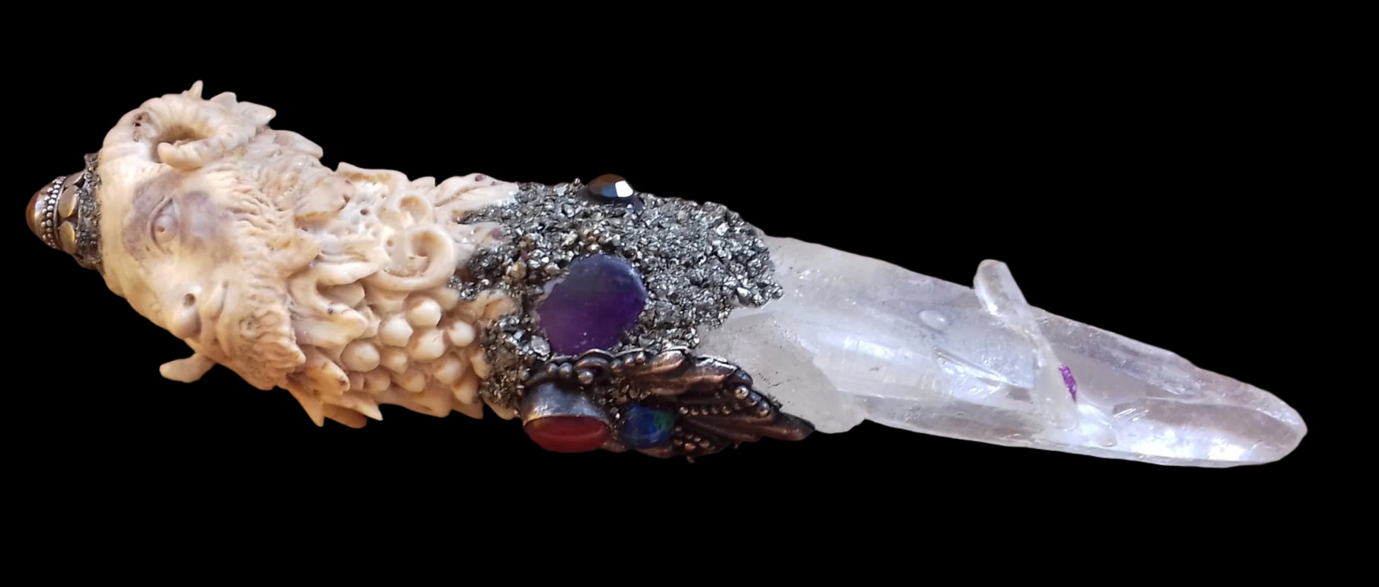 Ref.WD0014 - Ecologically sourced deer horn carved mythological Pan wand with laser quartz crystal, sugilite, carnelian, and azurite gemstones.