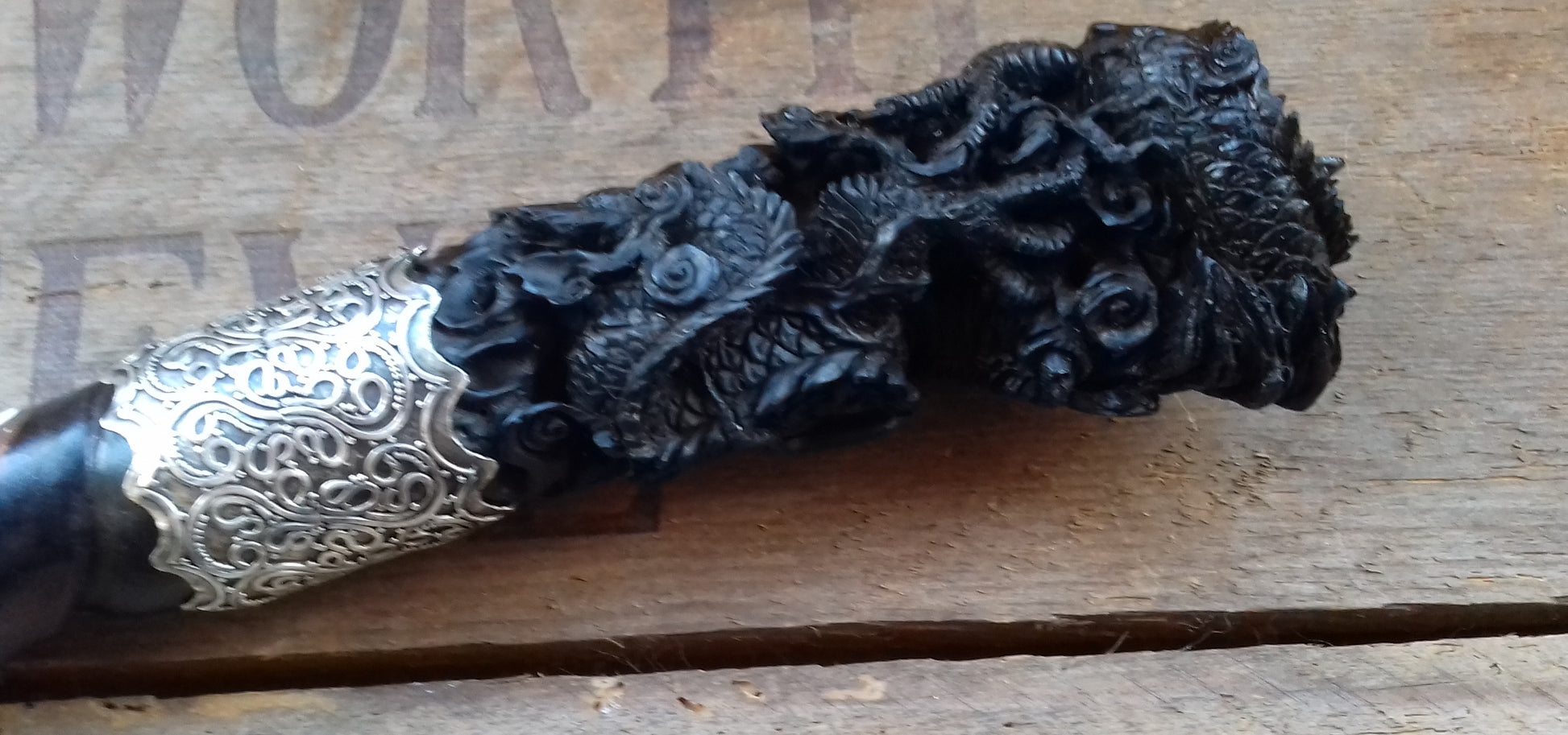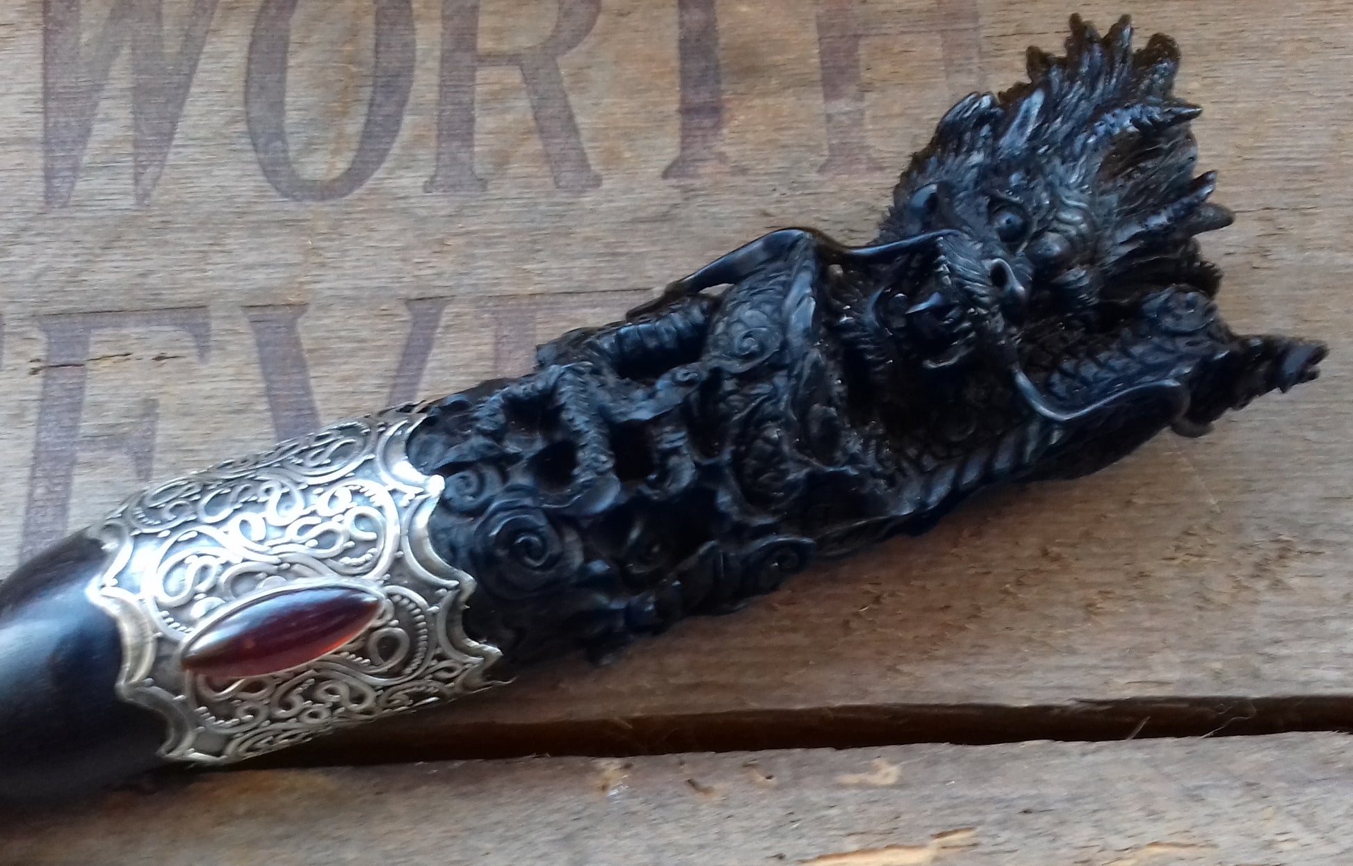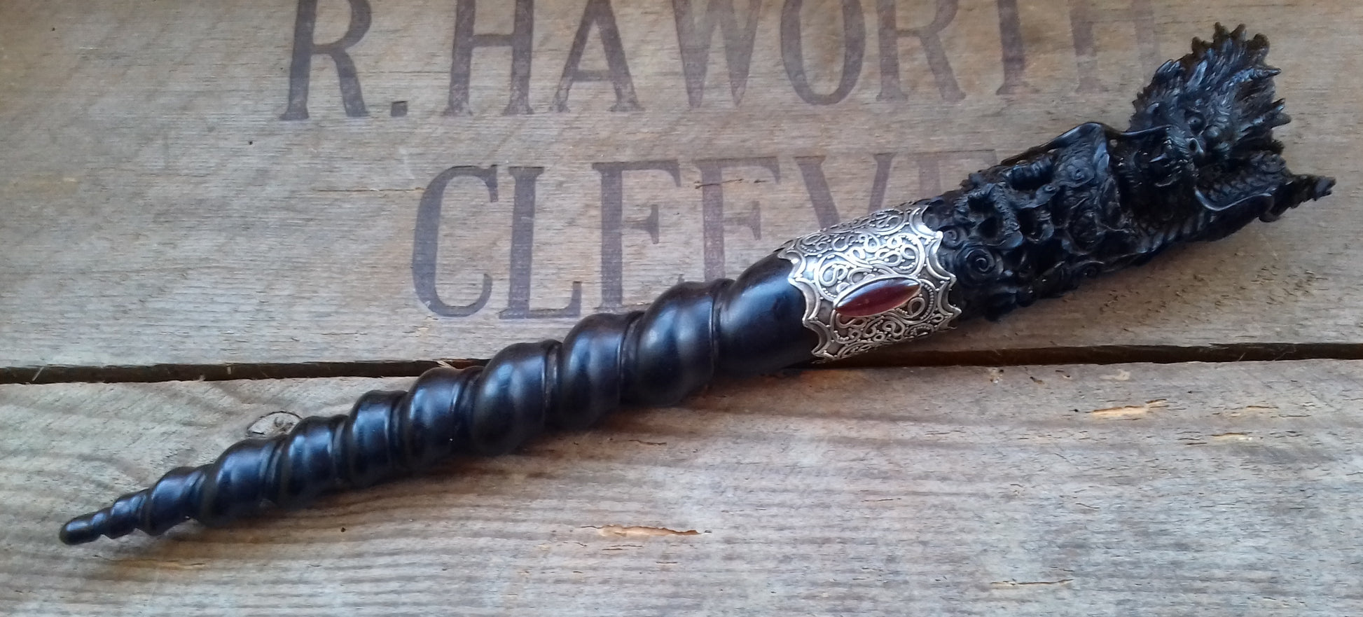 Ref.WD0022 - Iron wood carved dragon wand with silver work and garnet gemstone.