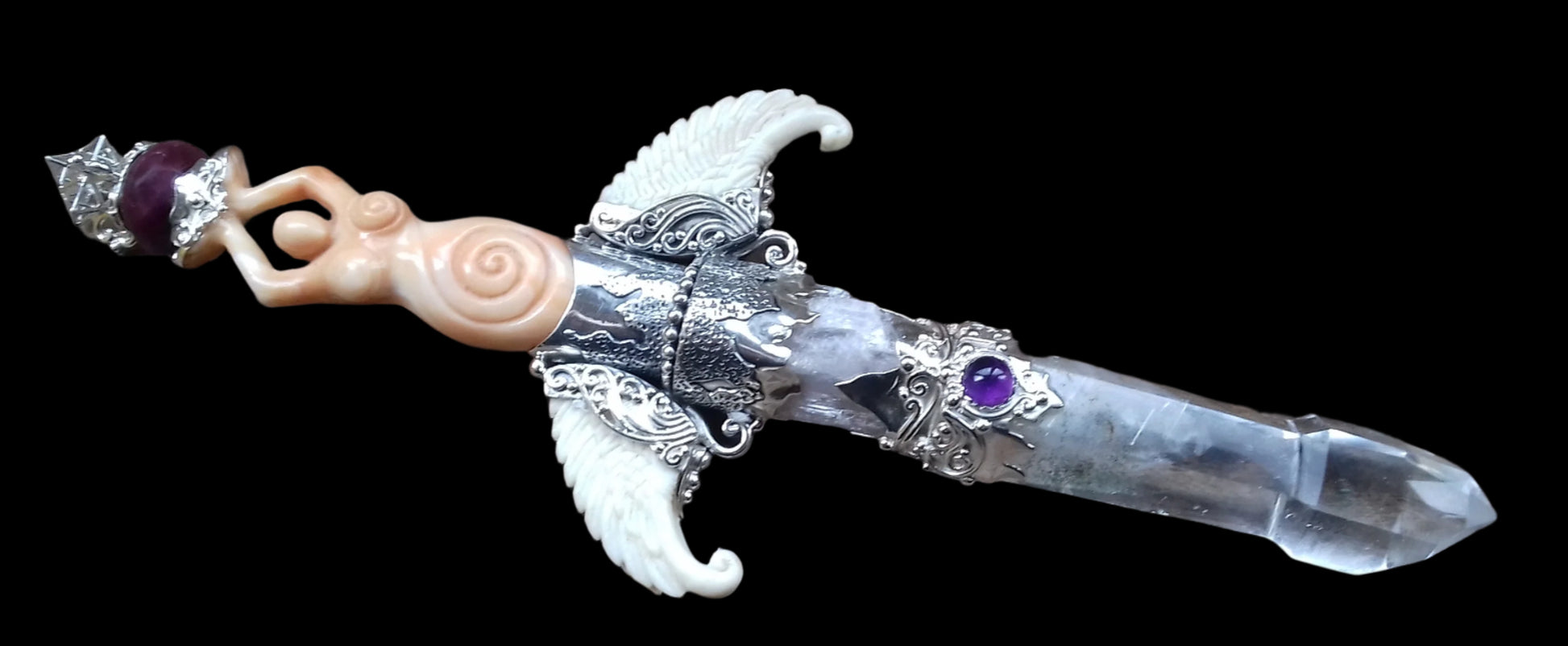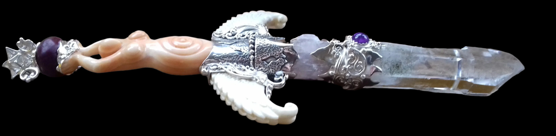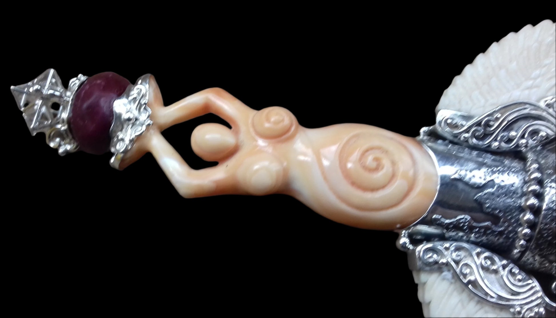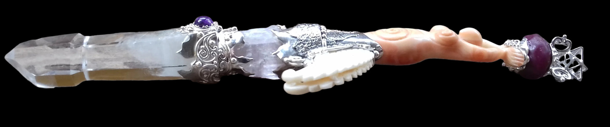 Ref.WD0035 - Wand with (top to bottom) silver Tantric Star geometry, ruby, conch carved woman, carved cross-guards in wing shape, pink kunzite, amethyst, and scepter quartz crystal.