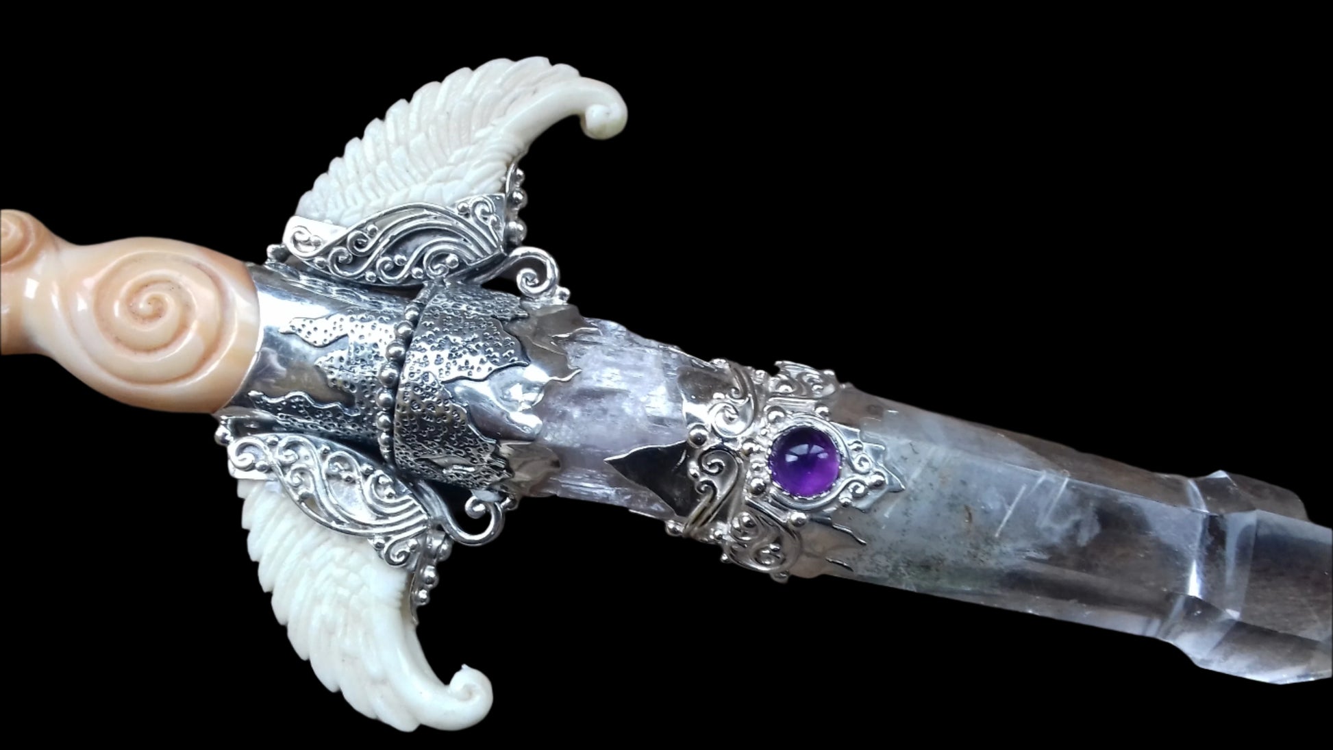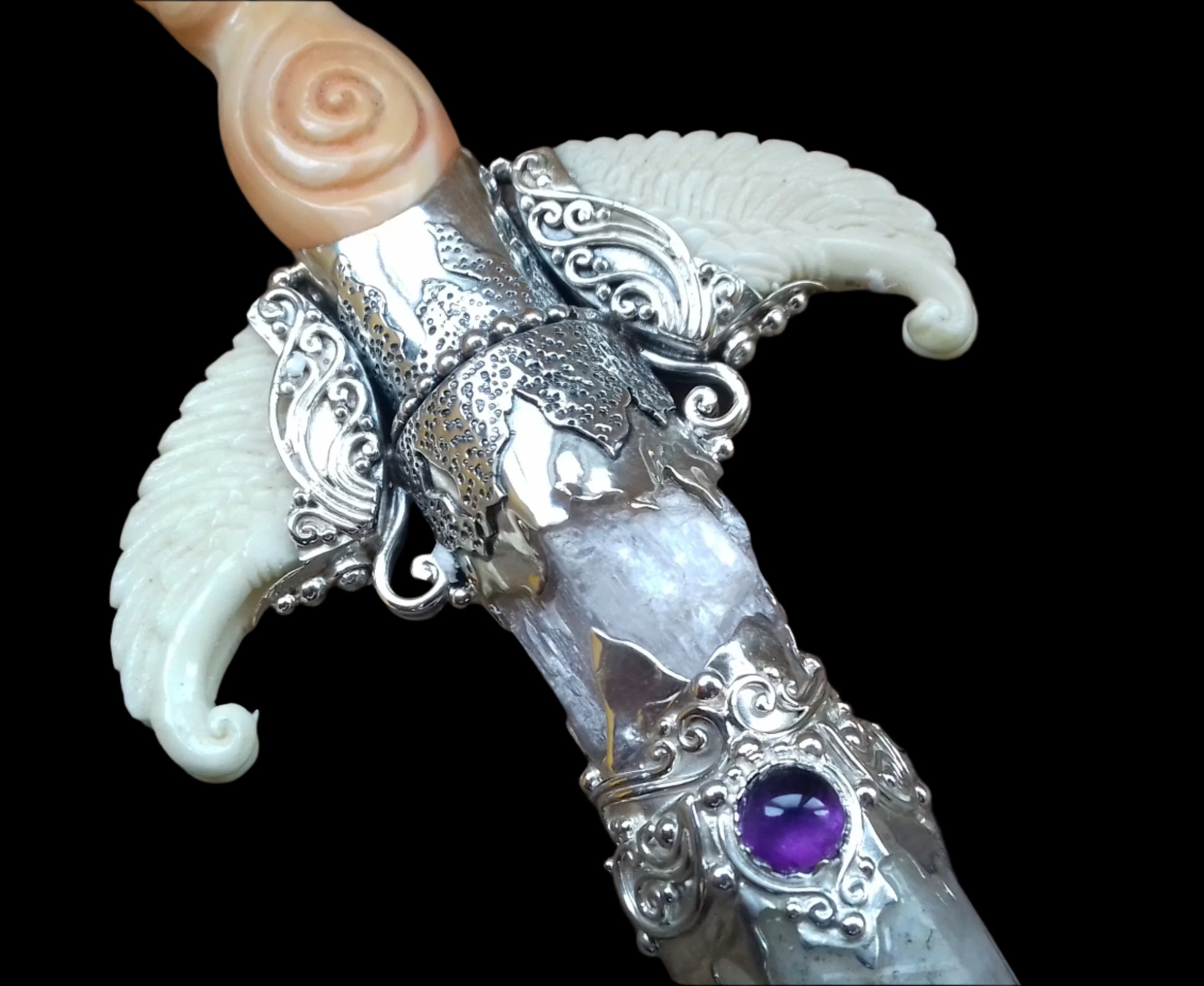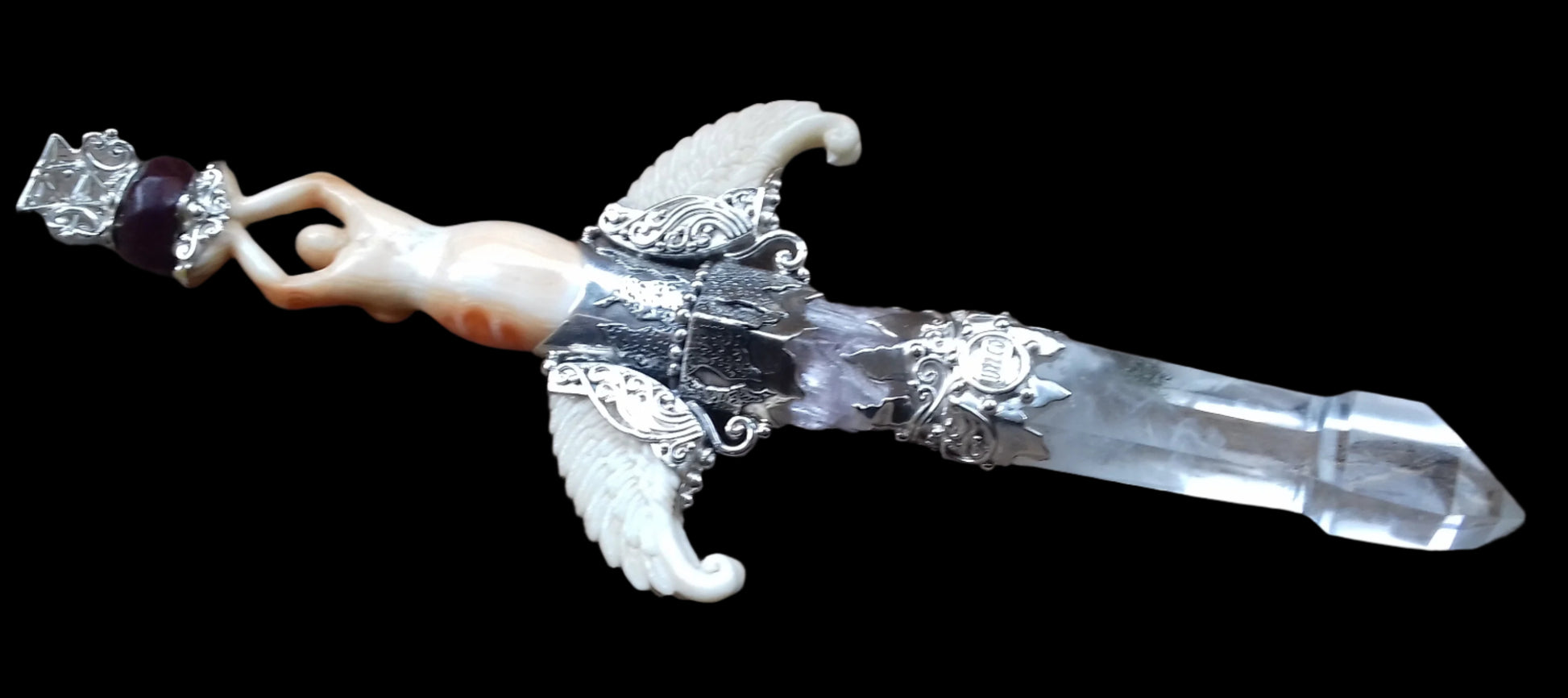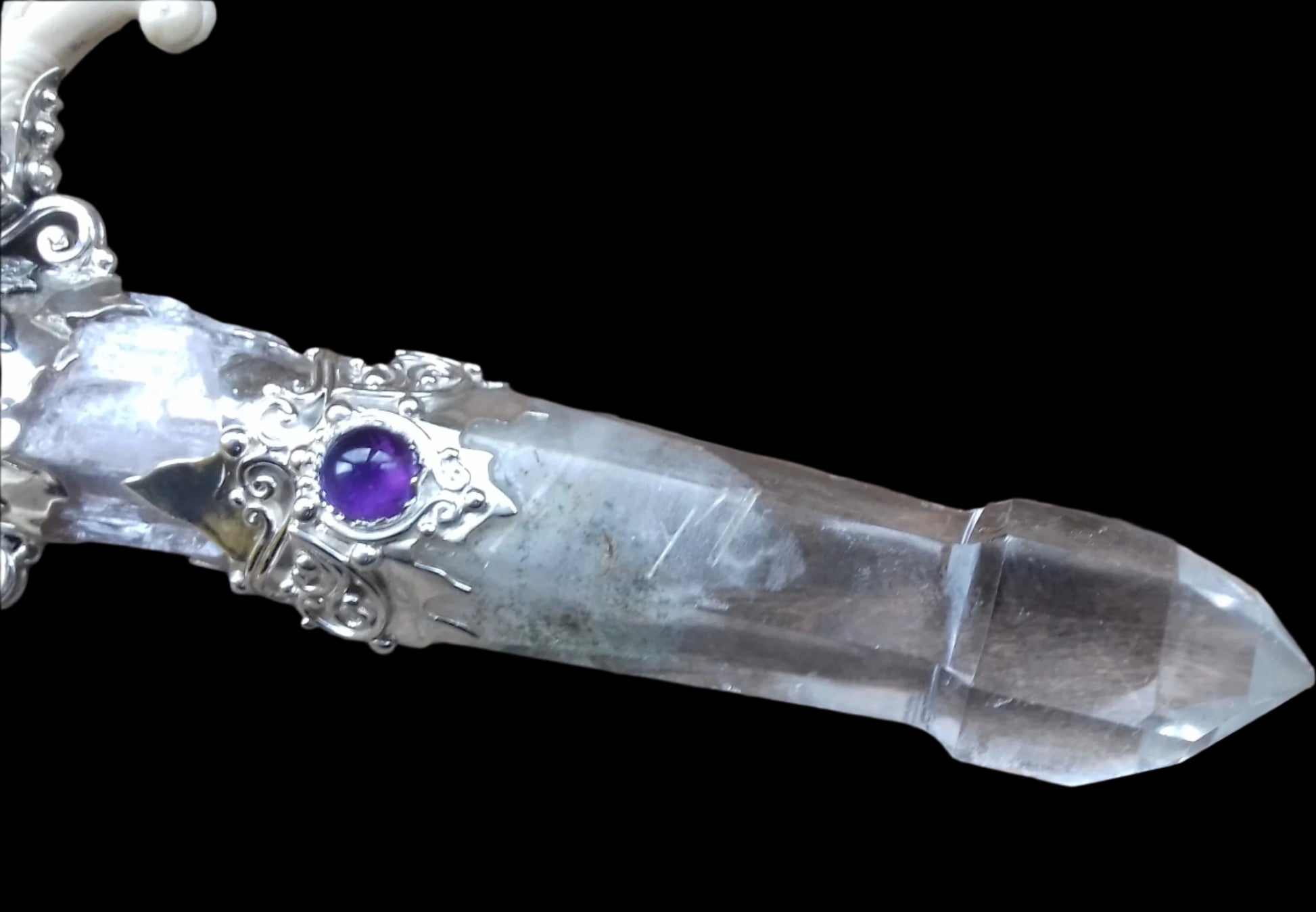 Ref.WD0035 - Wand with (top to bottom) silver Tantric Star geometry, ruby, conch carved woman, carved cross-guards in wing shape, pink kunzite, amethyst, and scepter quartz crystal.