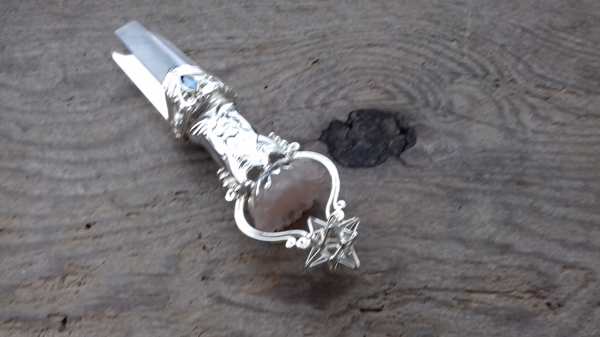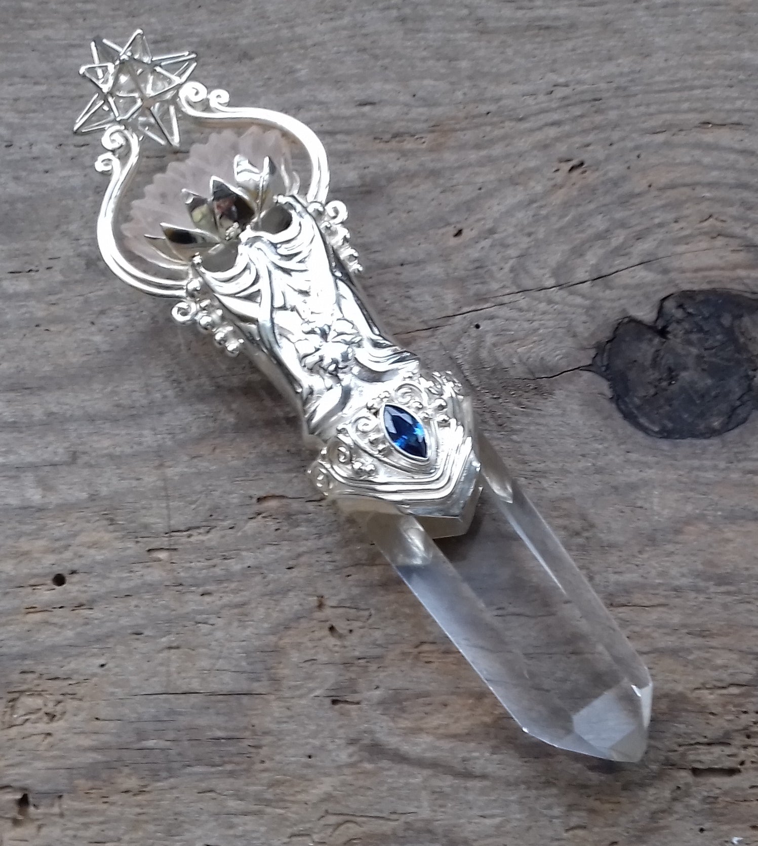Ref.WD0048 - Silver wand with Heart Star geometry, rose quartz carved lotus flower, sapphire gemstone, and clear quartz crystal.