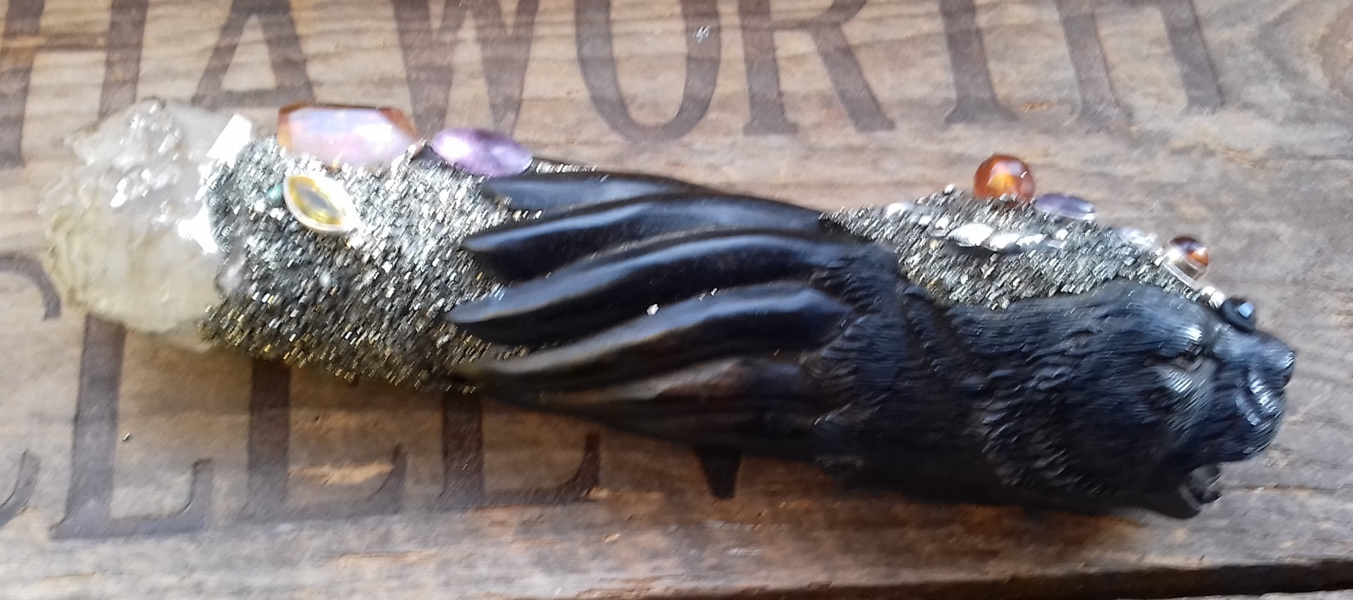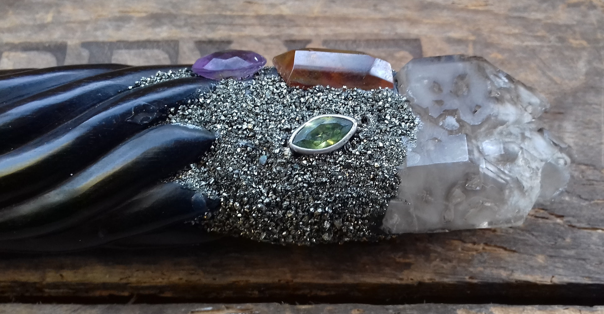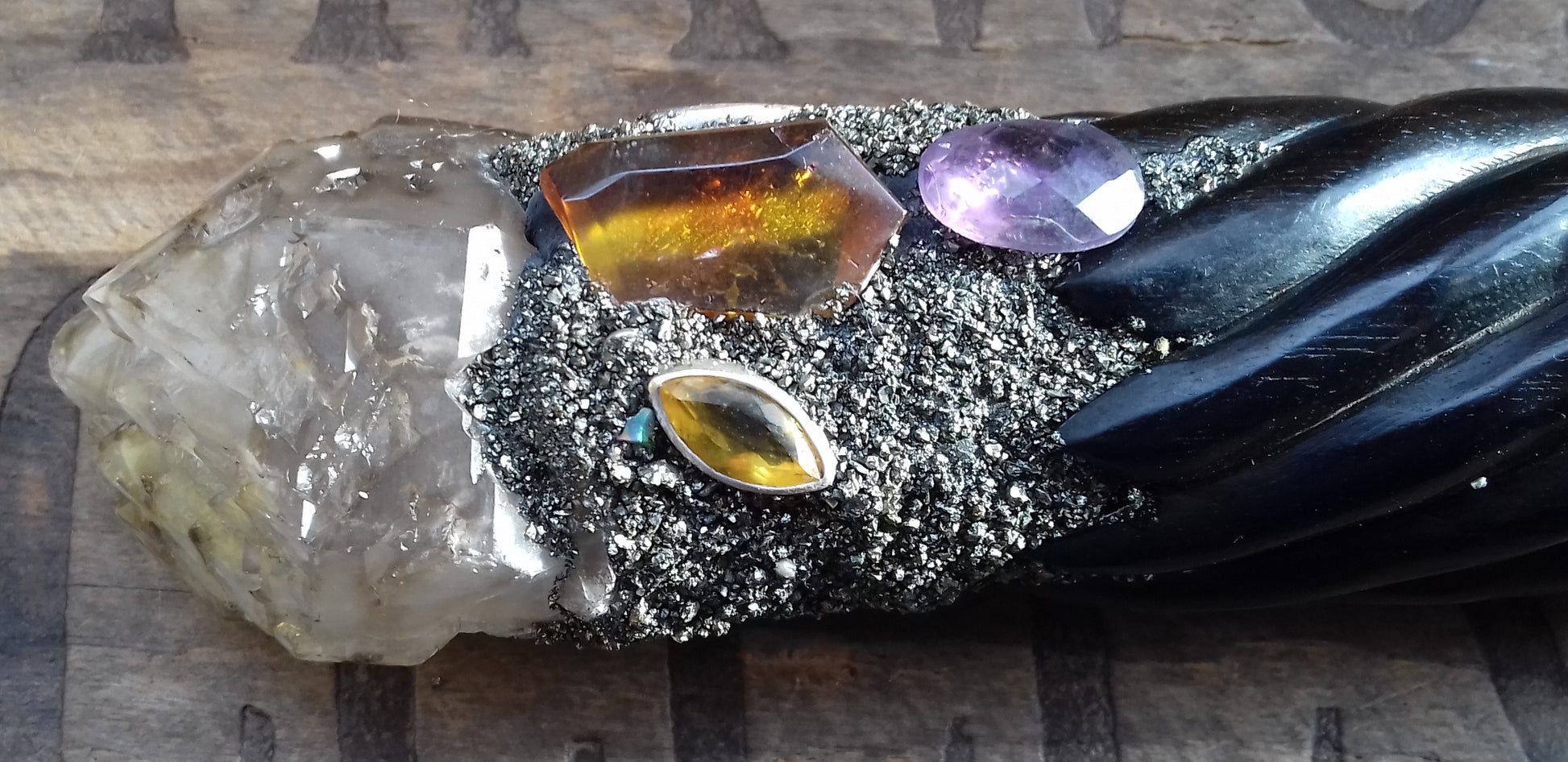 Ref.WD0051 - Wand with wood carved lynx, obsidian, smokey elestial quartz, amethyst, carnelian, peridot, citrine and amber.