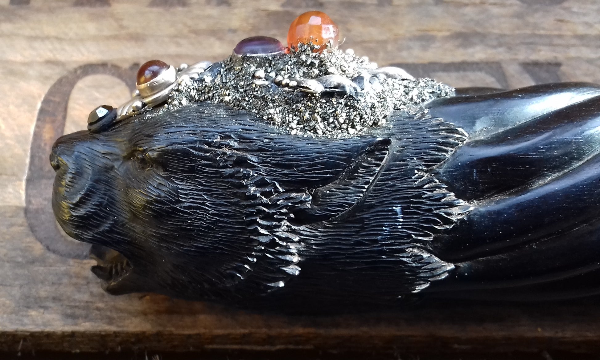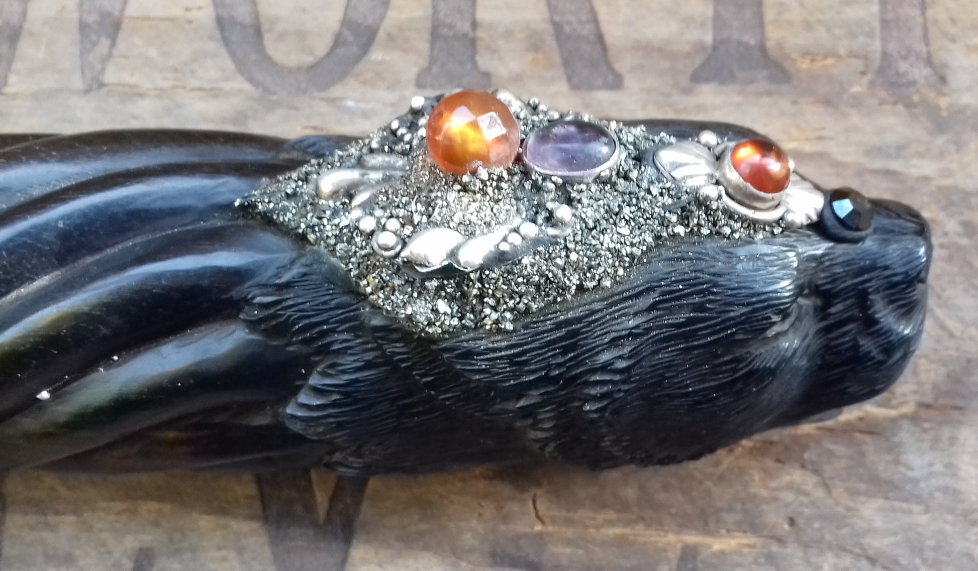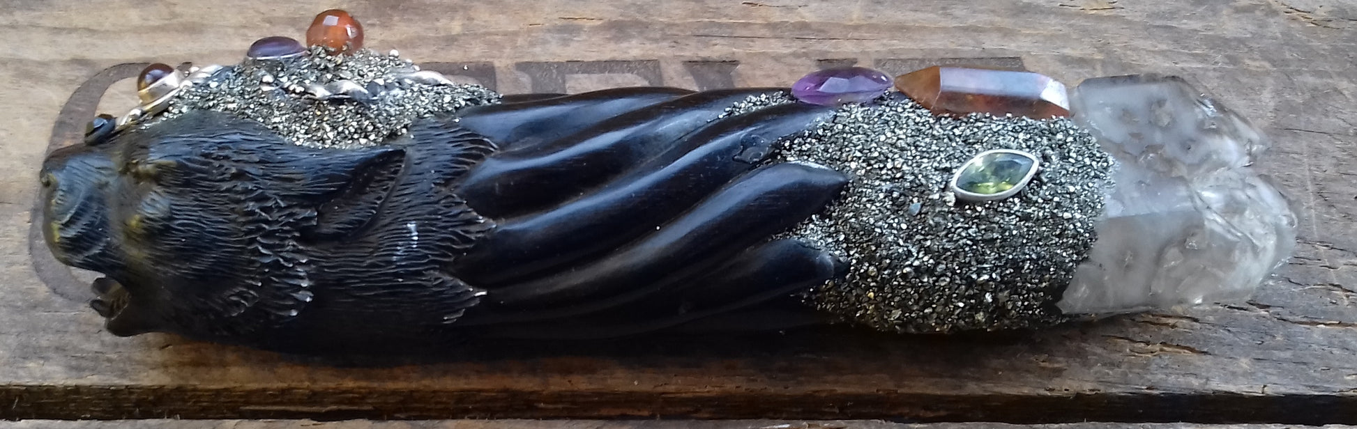 Ref.WD0051 - Wand with wood carved lynx, obsidian, smokey elestial quartz, amethyst, carnelian, peridot, citrine and amber.