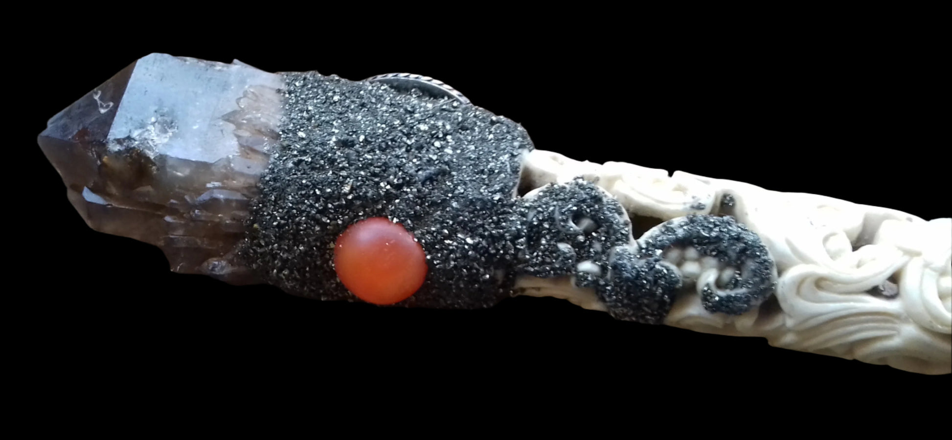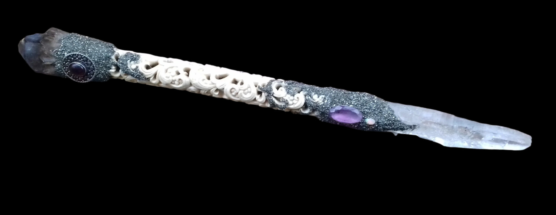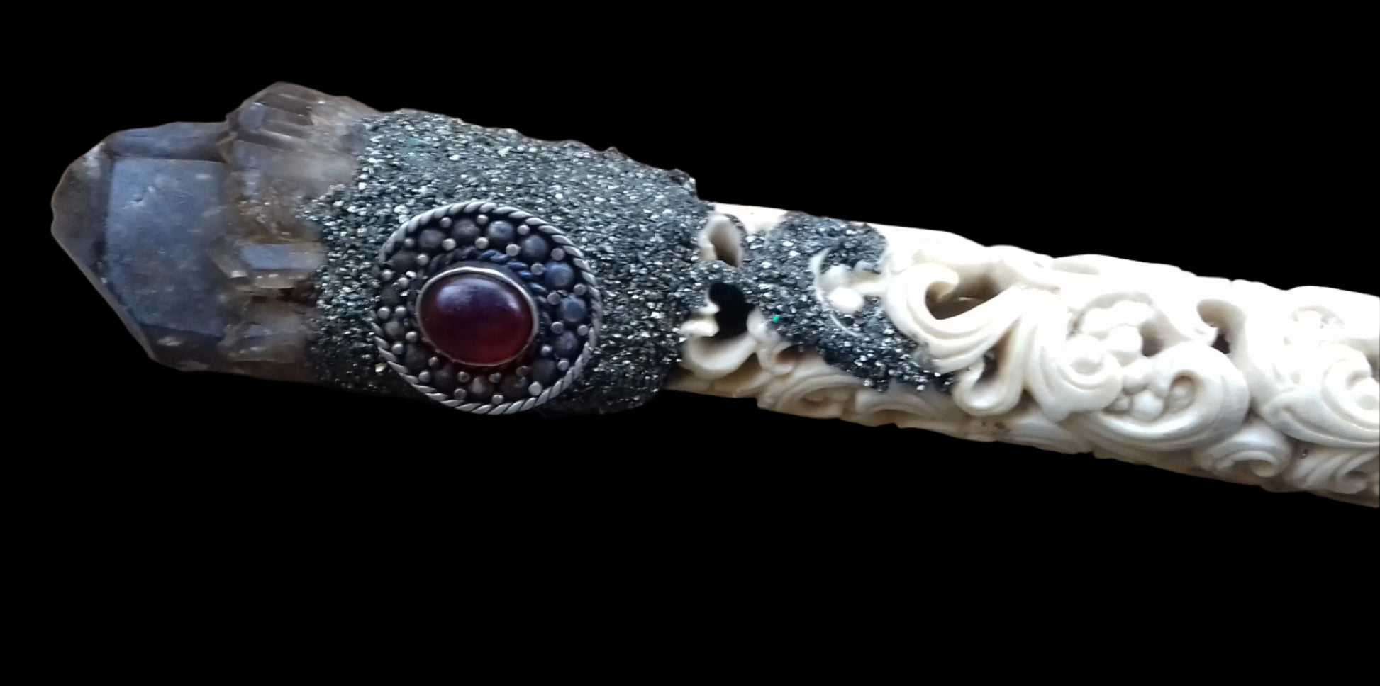 Ref.WD0057 - Wand with laser quartz, smokey citrine, opal, amethyst, garnet, carnelian, ruby, smoky elestial quartz, & carved handle.