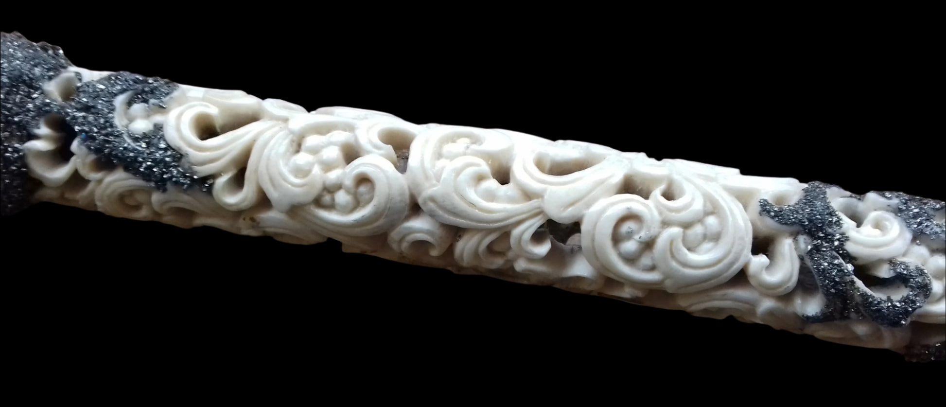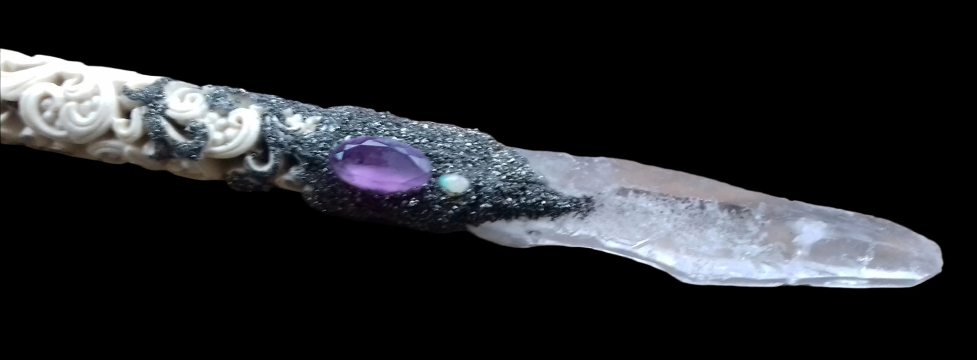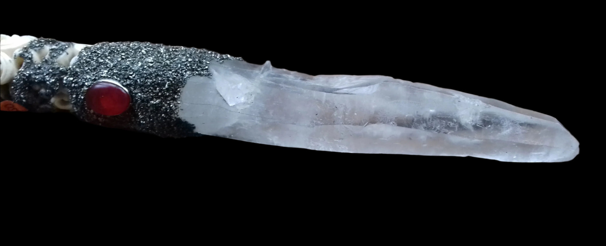 Ref.WD0057 - Wand with laser quartz, smokey citrine, opal, amethyst, garnet, carnelian, ruby, smoky elestial quartz, & carved handle.